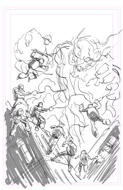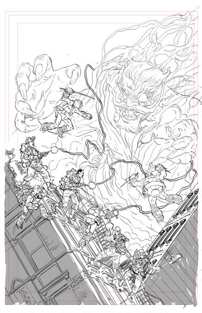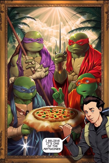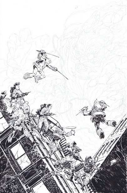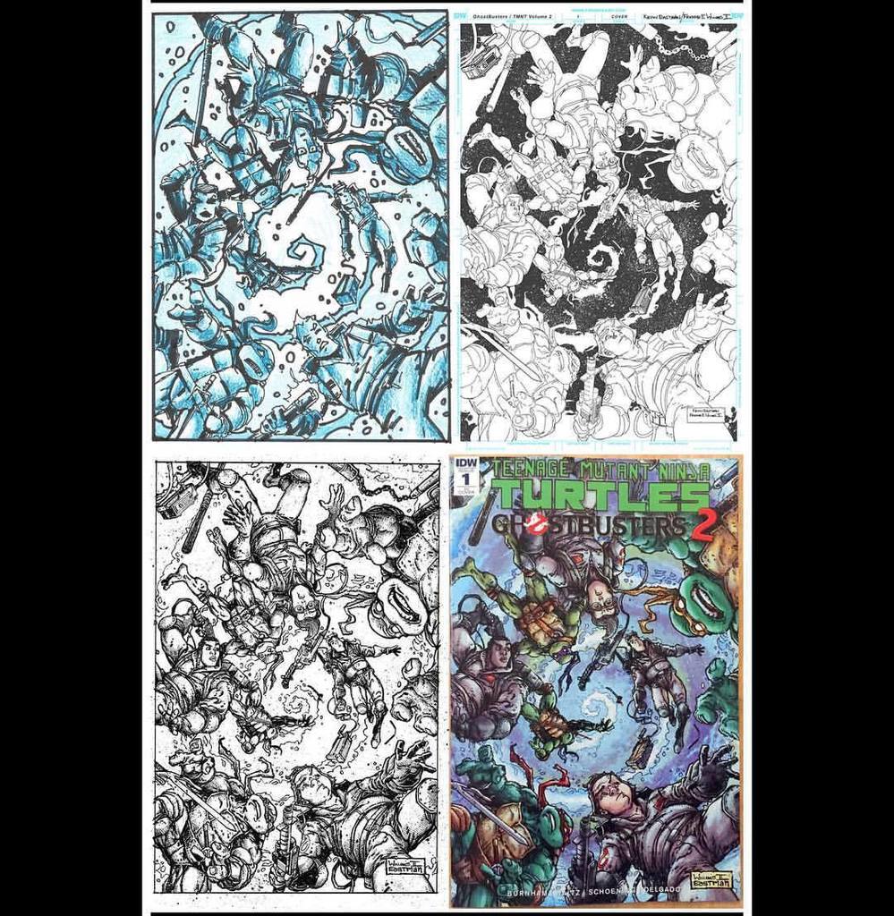 - Freddie Williams s’est vu honoré de pouvoir réaliser une couverture avec Kevin Eastman, l’un de ses héros d’enfance. Il partagea le 1er novembre sur son Twitter les étapes de la création de la couverture en question en remerciant le cro-créateur des tortues pour cette chance. Eastman conçut l’ensemble de la couverture avant de laisser Williams en réaliser sa version. Il termina par encrer le travail final de son collègue.