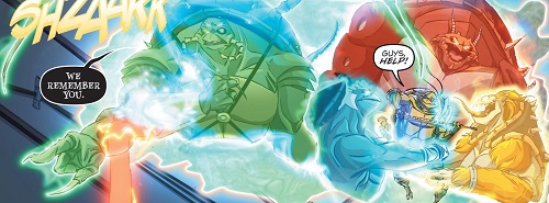 Les ninjas étaient retenus dans une sorte de prison ectoplasmique où flottaient dans le ciel d’imposants rochers. Elles se trouvaient sur l’un d’eux. Après que Donatello y ait été jeté, elles partirent à son chevet. C’est alors que le sol se mit à trembler. Un crâne gigantesque en sortit, leur disant qu’ils resteraient prisonniers de là pour toujours afin de briser le cœur de leur père. Petit à petit, l’être commença à prendre une forme plus humaine et se révéla être Darius Dun. Il comptait laisser les tortues pourrir là pendant des années afin de voir Splinter retourner la Terre pour les retrouver. Le voir désespérer et mourir dans le chagrin. Après… peut-être les laisserait-il partit ? Ou pas ! Leonardo admettait bien comprendre son désir de vengeance après la violente mort que lui avait réservé Splinter lors de leur dernière rencontre (TMNT #64). Les tortues devaient s’activer et trouver de la nourriture et de l’eau au plus vite. Un portail s’ouvrit derrière elles. Ray, Peter et Winston apparurent devant les tortues. Ils donnèrent à Donatello un casque et demandèrent aux autres tortues de rester là encore un petit peu. Ils connaissaient ces entités. La manœuvre serait quelque peu complexe.