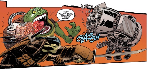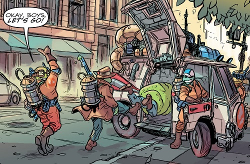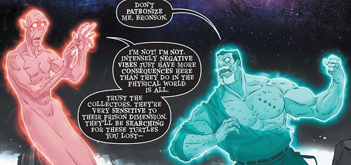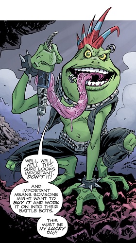 Toujours cachés dans un immeuble en ruines, Leonardo et Winston constataient que les combats à l’extérieur s’étaient calmés. Les batteries du créateur de portails étaient de nouveau opérationnelles. Ils allaient pouvoir s’en aller de cet univers chaotique. Mais quelque chose de long et gluant saisit le poignet de Winston et s’empara de l’appareil. Il s’agissait d’une grenouille punk. Le ghostbuster n’avait aucune envie de lui tirer dessus, ni pour la tuer, ni pour endommager l’appareil. Mais la créature les invitait à la capturer s’ils voulaient récupérer ce qui leur appartenait. Courant à travers les rues de la ville, ils s’arrêtèrent soudain face à un mur. La grenouille était prise au piège – ou tout du moins elle le prétendait. Trois semblables la rejoignaient bientôt, encerclant Leonardo et Winston. Ils leur demandaient leurs armes, et tout autre objet technologique. Qu’ils essaient ! Leonardo fondit sur deux des grenouilles, tranchant net le bras bionique de l’une d’elles et jetant au sol les deux autres. Winston chauffait ses poings contre la troisième. Il ne restait bientôt plus que la quatrième, le voleur du bracelet. Ce n’étaient que des petits voyous qui fonctionnaient à l’intimidation. Ils n’étaient pas très dangereux. Reprenant son appareil, Winston était prêt à s’en aller. Soudain, un portail s’ouvrit dans le ciel. Les Collectors les avaient retrouvés…