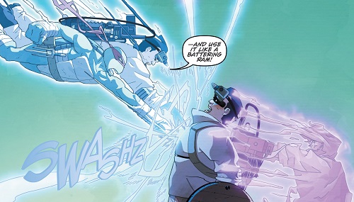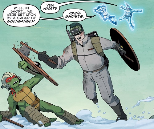 Raphael peinait à reprendre ses esprits. Il flottait dans les airs aux côtés de Ray. Sous leurs pieds, leurs corps se battaient avec des haches et des boucliers. Autour d’eux, les esprits de nombreux guerriers vikings, des gjengangers. Les deux amis avaient été expulsés de leurs corps et possédés par deux guerriers heureux de retrouver les plaisirs du combat, de la douleur et de la fatigue. Raphael ne comprenait rien de ce qu’il se passait là. Ray essaya de communiquer avec eux par la pensée, leur demandant de leur restituer leurs corps. Les fantômes se mirent à éclater de rire. Le chasseur de fantôme venait-il réellement de leur demander de manière courtoise une telle faveur ? Stop le blabla, passe au combat pour Raphael qui fondit sur son corps pour reprendre possession. Il se heurta au viking qui n’était pas prêt à le lui rendre. Ray et lui allaient devoir concentrer leurs forces. Ils rentrèrent de plein fouet dans le corps de l’humain, expulsant ainsi l’intrus. Leur plan avait fonctionné ! Mais Ray n’était pas attentif, Raphael, coincé dans le même corps, dut l’alerter de l’attaque de son corps de mutant. Le Ghostbuster s’était égaré dans les pensées de Raphael et était surpris de voir que la tortue se sentait si seule alors qu’il était si bien entouré. Ils allaient devoir se battre contre le corps de Raphael. Pour cela, la tortue lui demanda de le laisser gérer son corps, espérant que ses articulations ne soient pas trop rouillées…