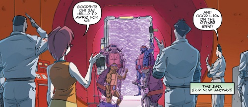 De retour à la caserne, Ray rassurait Raphael. Leurs cinq ennemis ne sortiront pas de ce l’unité, ils n’en avaient pas les moyens. Ils en étaient enfin débarrassés. Il était temps de se dire de nouveau au revoir. Leonardo regrettait juste qu’ils n’aient pas eu le temps de s’assoir et discuter et faire mieux connaissance pour une fois, toujours sous le feu d’une menace. Peter offrit un livre sur la psychologie à Michelangelo (TMNT / Ghostubsters 2 #4) et Donatello promettait à Egon de lui confier les données sur Metalhead quand ils se reverraient. Les tortues rentraient dans leur dimension !