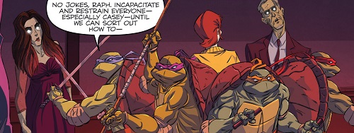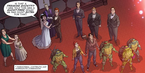 Le mariage dans l’église présente des personnages bien connus de cet univers des Tortues Ninja. La mariée reprend les traits d’Irma Langinstein et son futur époux Howie Hardy. Leurs témoins sont Vernon Fenwick et Burne Thompson.
