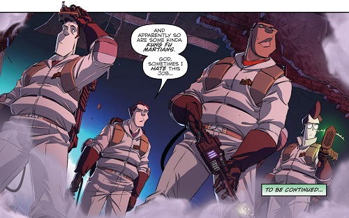 Soudain, un mur de l’église fut soufflé par une explosion. Les quatre chasseurs de fantômes s’étaient invités à la partie. Tandis qu’Egon se rassurait voyant qu’ils n’avaient fait aucun blessé en pulvérisant le mur gouttereau, ses collègues regardaient ce à quoi ils allaient avoir à faire. Un démon, quelques zombies et quatre martiens faisant du kung-fu. Rien que ça !
