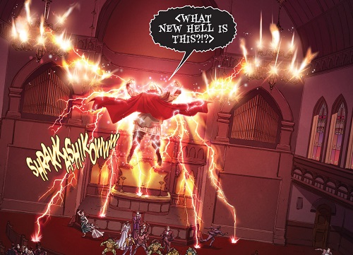À plusieurs mètres au-dessus du sol, sous la voûte de la nef, une lueur rouge apparut et une forme se matérialisait à son tour. Poussant des cris de joie, la créature était enfin libre. Il s’agissait de Chi-You. Mais celui-ci ne comprenait pas où il était, rien ne ressemblait à ce qu’il connaissait et pire encore, il ne ressentait plus la présence ni de Kistune, ni des autres membres du Pantheon. Il était sorti de l’enfer où il se trouvait prisonnier depuis des lustres. Mais il n’était pas encore chez lui. Sa colère se changea en éclairs, tous les systèmes électriques de l’église explosèrent. L’être immortel se sentait plus fort qu’auparavant, avec de nouveaux pouvoirs entre les mains.