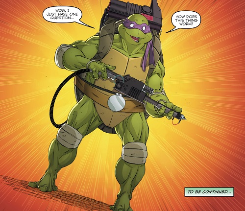 As the teams split up to evade their spectral pursuers, Michelangelo and Peter Venkman enter a dimension populated by anthropomorphic animals… including Turtle Ghostbusters !
