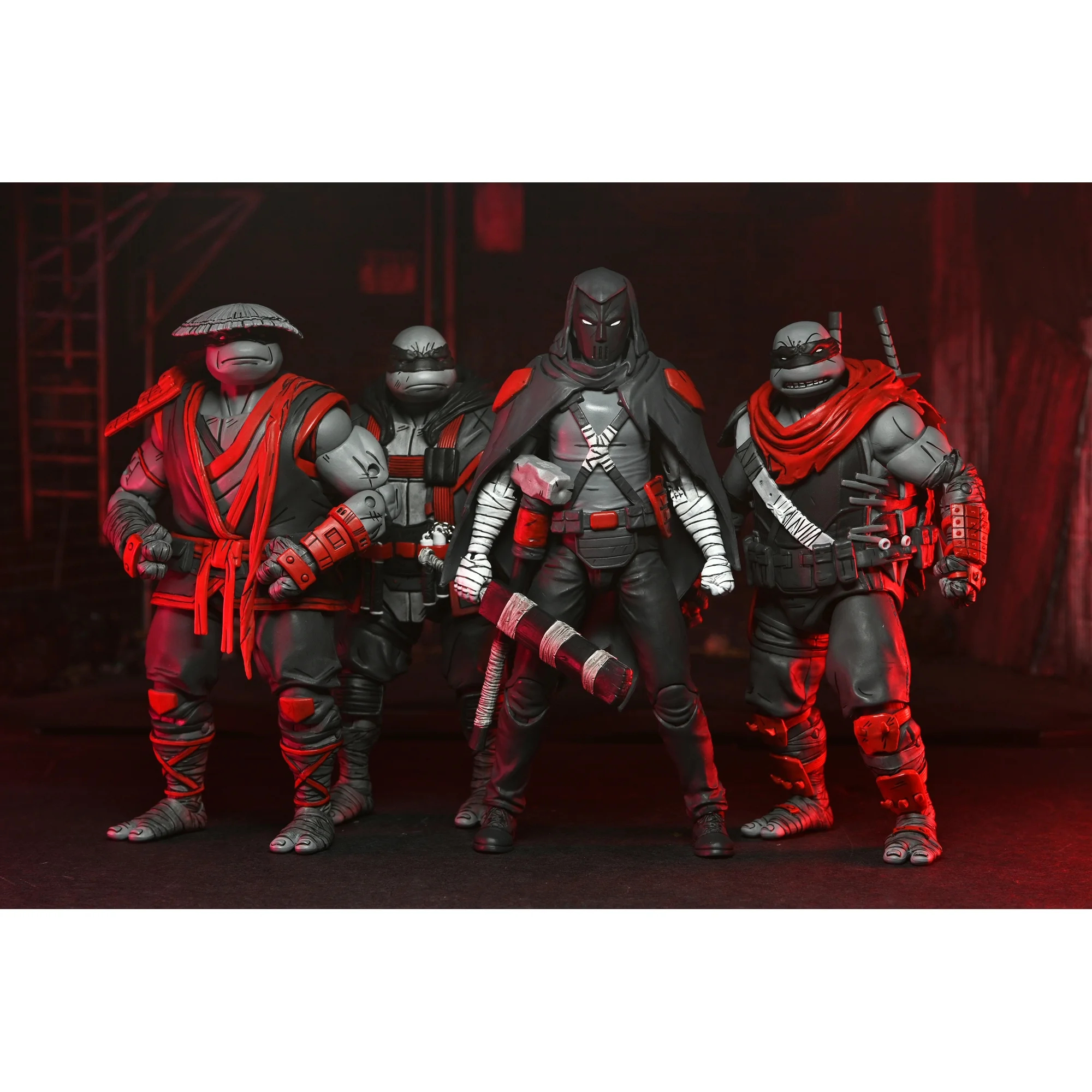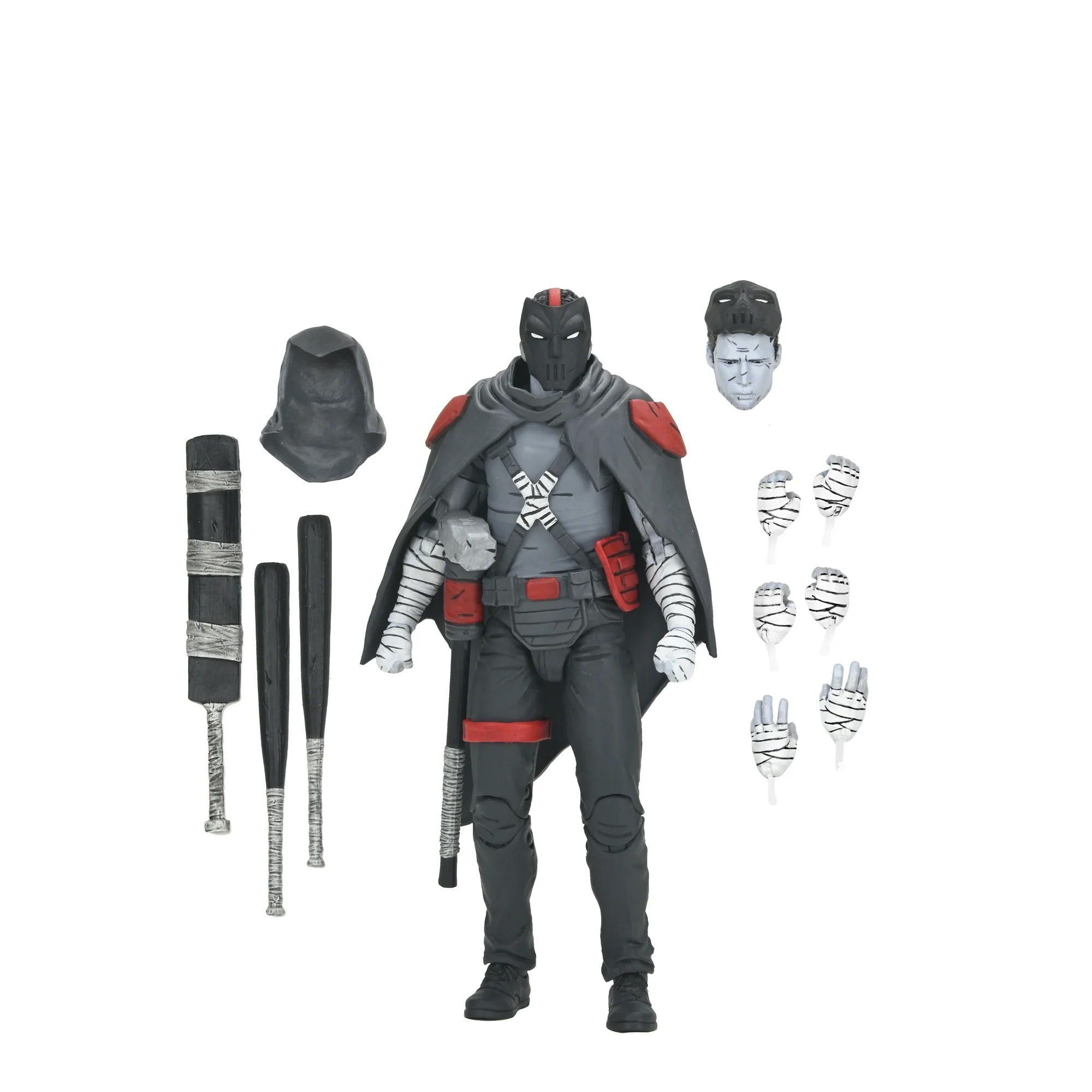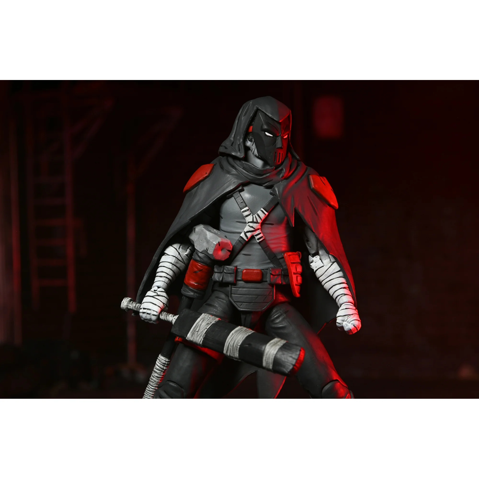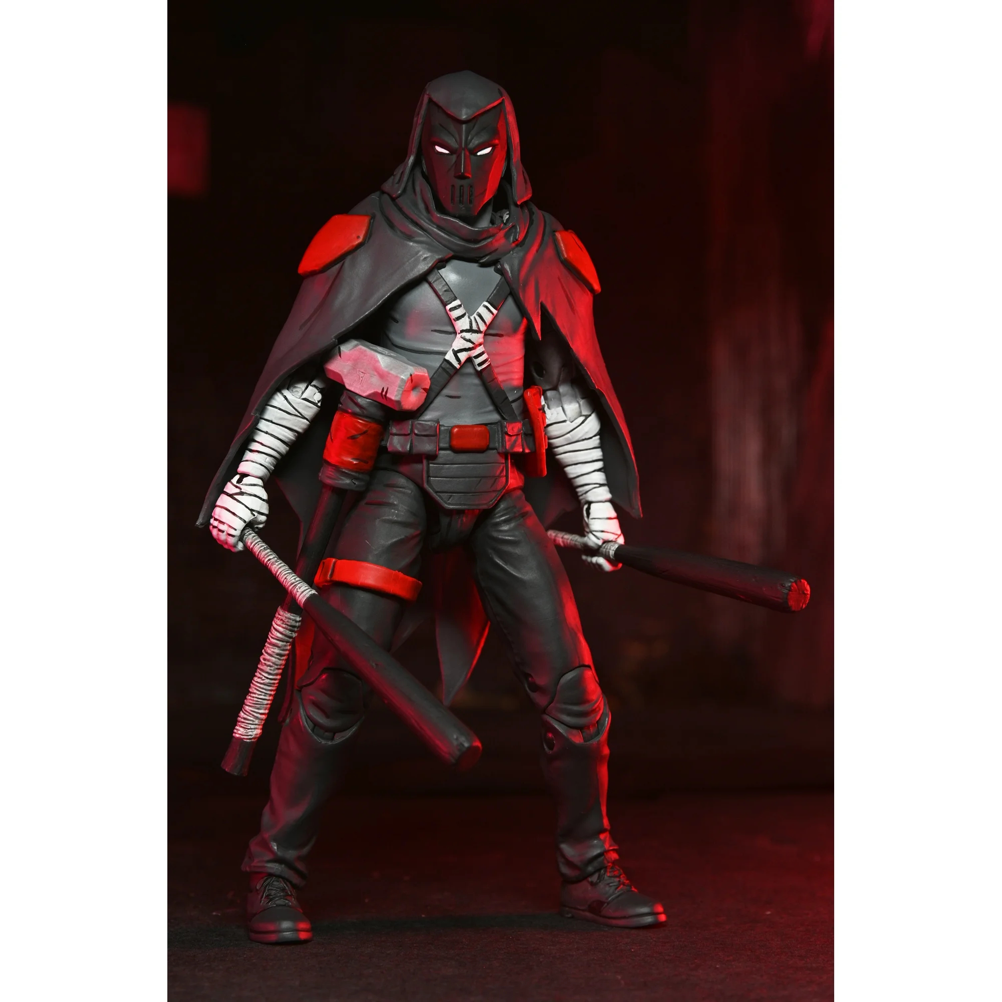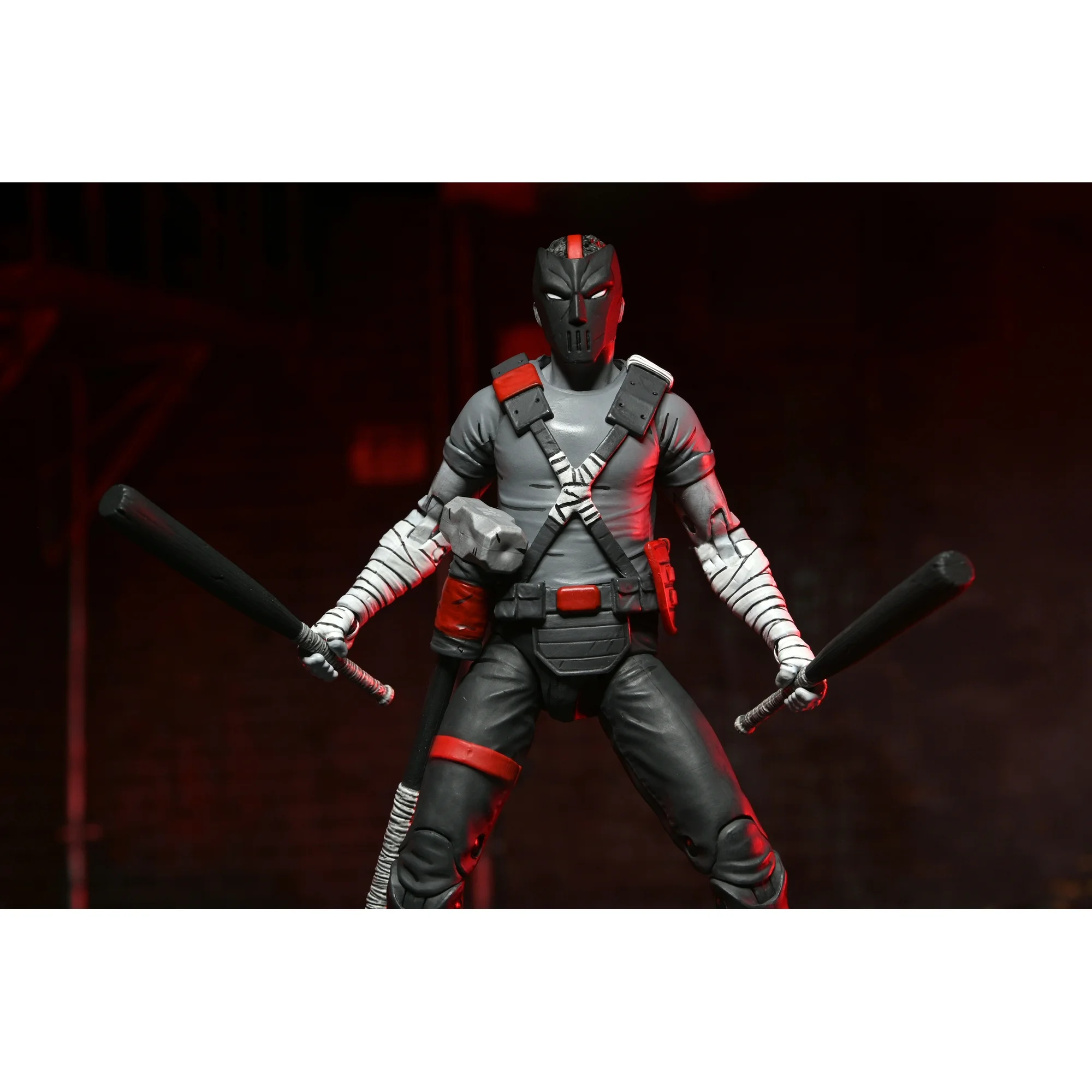 La figurine de Casey Jones en Nightwatcher a été révélée en décembre 2024 par NECA à l’occasion de la sortie des planches des différents univers du fabricant. Contrairement aux tortues, le justicier n’était pas apparu lors de la Comic Con de New York, en octobre. Il est apparu au travers d’un court passage de Lost years #3.