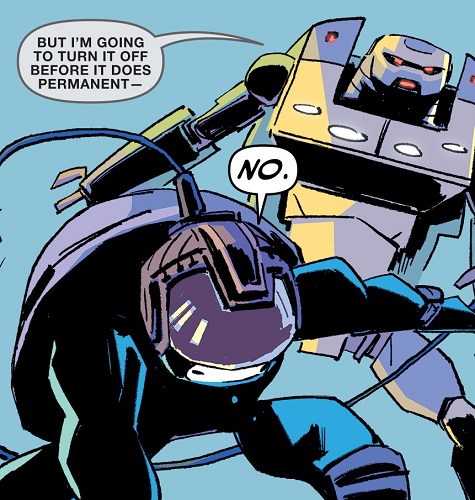 La nuit venue, Donatello fut réveillé par un bruit dans son laboratoire. Harold était-il revenu pour l’aider ? Ça aurait pu attendre se disait-il. Quelle ne fut pas sa surprise, lorsqu’il se retrouva nez à nez face à Metalhead ? Le robot tenait entre ses pinces le casque que comptait user la tortue pour prédire ses mouvements. Il prétendait que cela ne fonctionnerait pas. Croyant qu’il était là pour le tuer, comme il l’avait juré lors de leur dernière rencontre (TMNT Universe #8), Donatello lui sauta dessus avec son bâton. Une attaque inutile que le robot n’eut aucun mal à retourner à son avantage, saisissant l’arme et jetant son propriétaire dans les ordinateurs. Il n’était pas là pour le tuer – pour le moment – mais bien pour parler ; il voulait relever un défi. Impossible de raisonner la tortue, qui partit se réfugier dans un salle spéciale de son laboratoire ; il poussa une herse avant de se précipiter vers sa pagaille informatique. Tapant le plus vite possible sur son clavier, il voulait empêcher que le robot, qui viendrait très rapidement à bout de la grille de protection, de mettre la main sur ses recherches. Ce n’était pas ce que le robot voulait. Il était persuadé en se rendant ici que Donatello voulait créer un nouveau Metalhead. C’était ce message qu’il avait reçu, tel un émetteur, et qui l’avait mené ici ce soir. Mais à y regarder de plus près, ce casque qu’il tenait entre ses pinces, semblait être sa véritable expérience. Il le répétait, hors de question de tuer la tortue. Il voulait des informations.