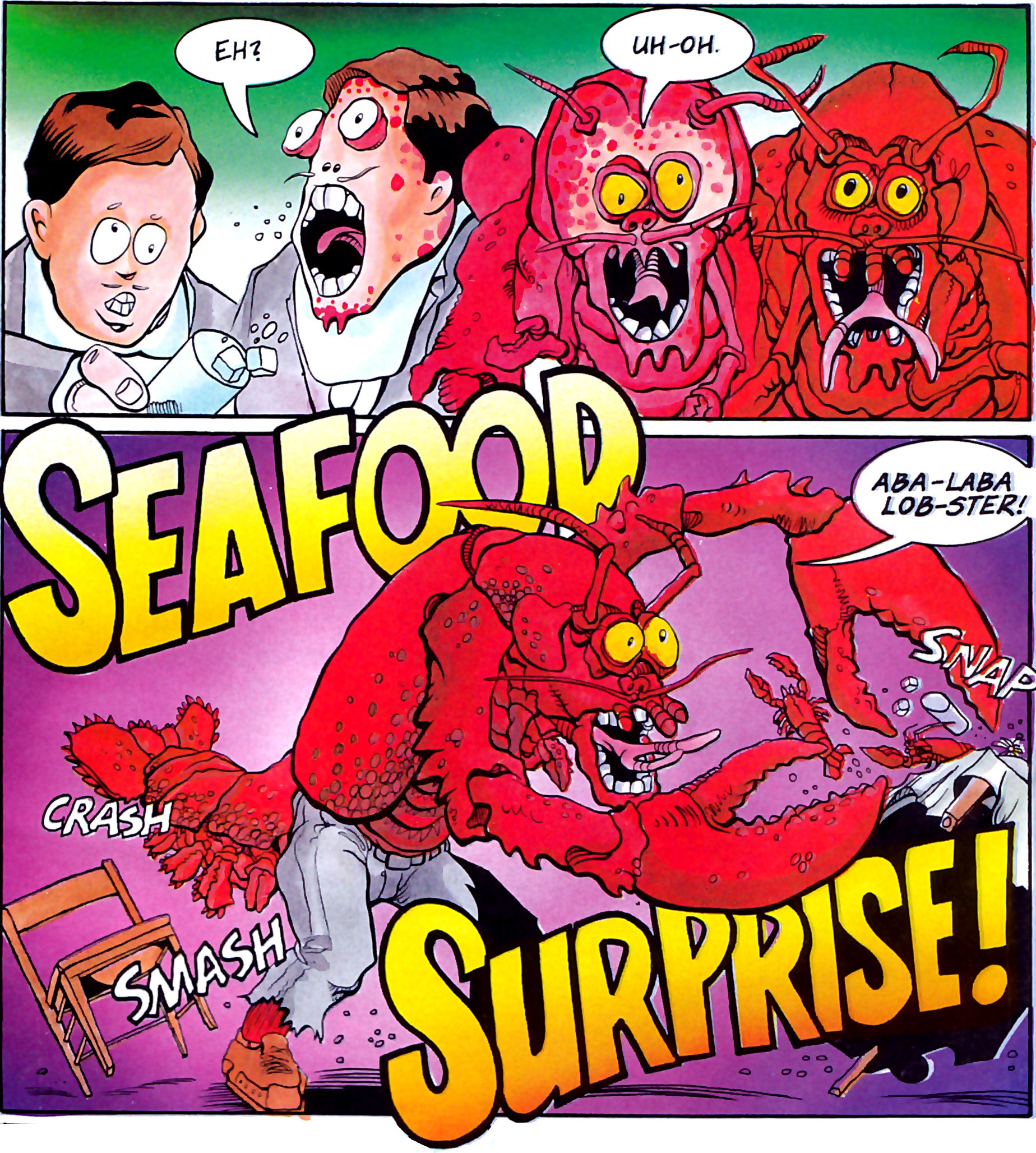Les tortues commandaient des pizzas dans un restaurant. Pendant ce temps, un client du nom de Stanley Stobbs recevait les homards demandés. Buvant un verre d’eau, il se changeait immédiatement en homard mutant. Raffolant de ces crustacés, il n’avait pas compris qu’il s’était transformé en l’un d’eux, et réclamait quelques homards à se mettre sous la dent. Devenu incontrôlable, il mettait le restaurant sens dessus-dessous.