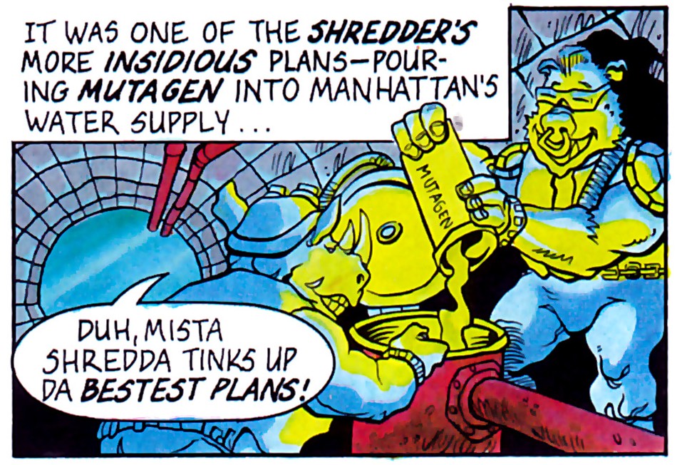 Bebop et Rocksteady avaient déversé du mutagène dans les conduites d’eau de la ville. Shredder voulait transformer les habitants de New York en mutants.