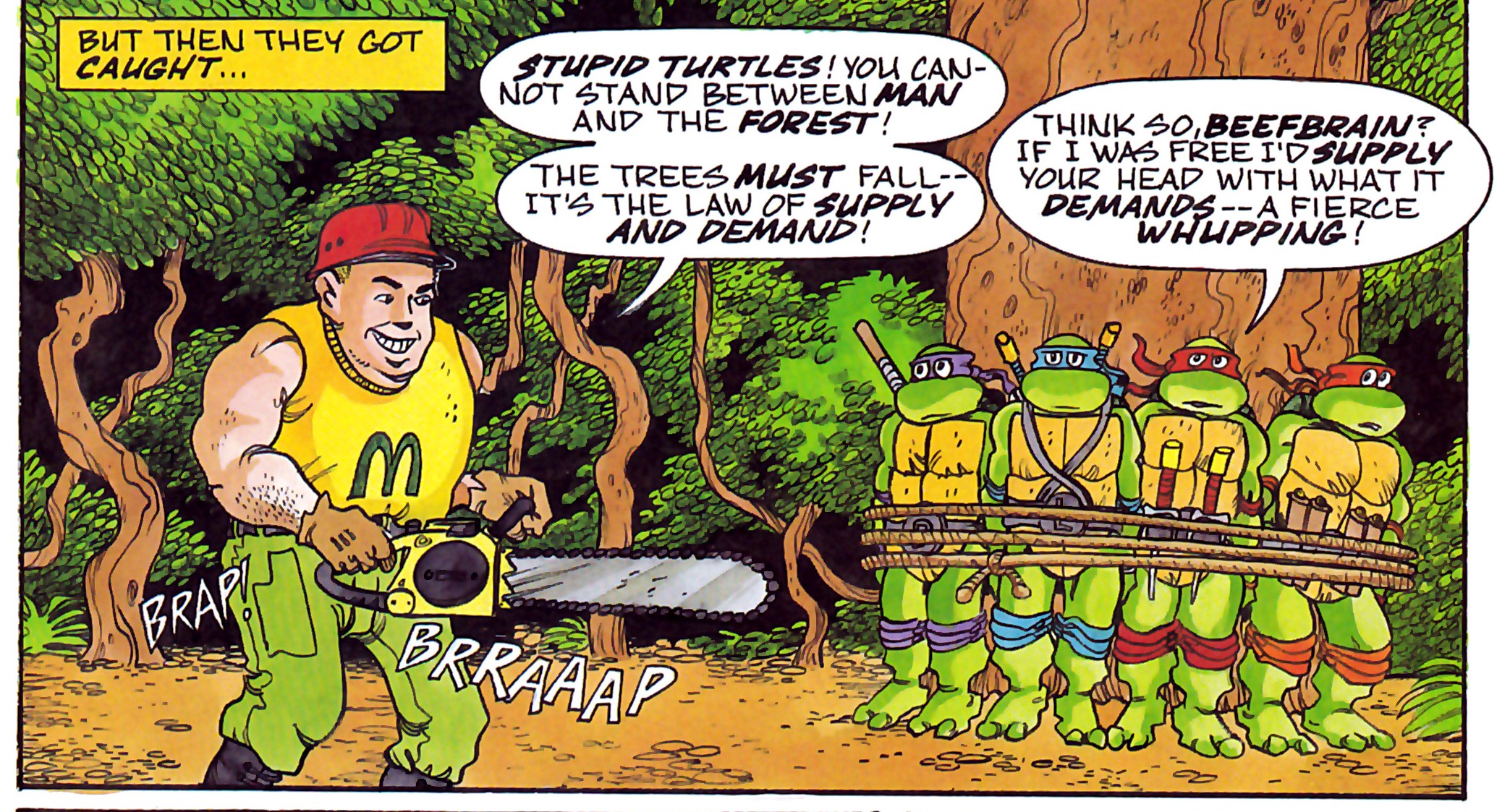 Les tortues étaient parties pour la forêt amazonienne afin de voir comment aider ce paradis hélas plus si vierge depuis l’intervention des humains. Elles s’étaient faites capturer par des bûcherons qui n’avaient qu’une hâte, faire retentir leurs tronçonneuses. Solidement ligotées à un arbre, elles voyaient un de ces individus rire de leur sort.