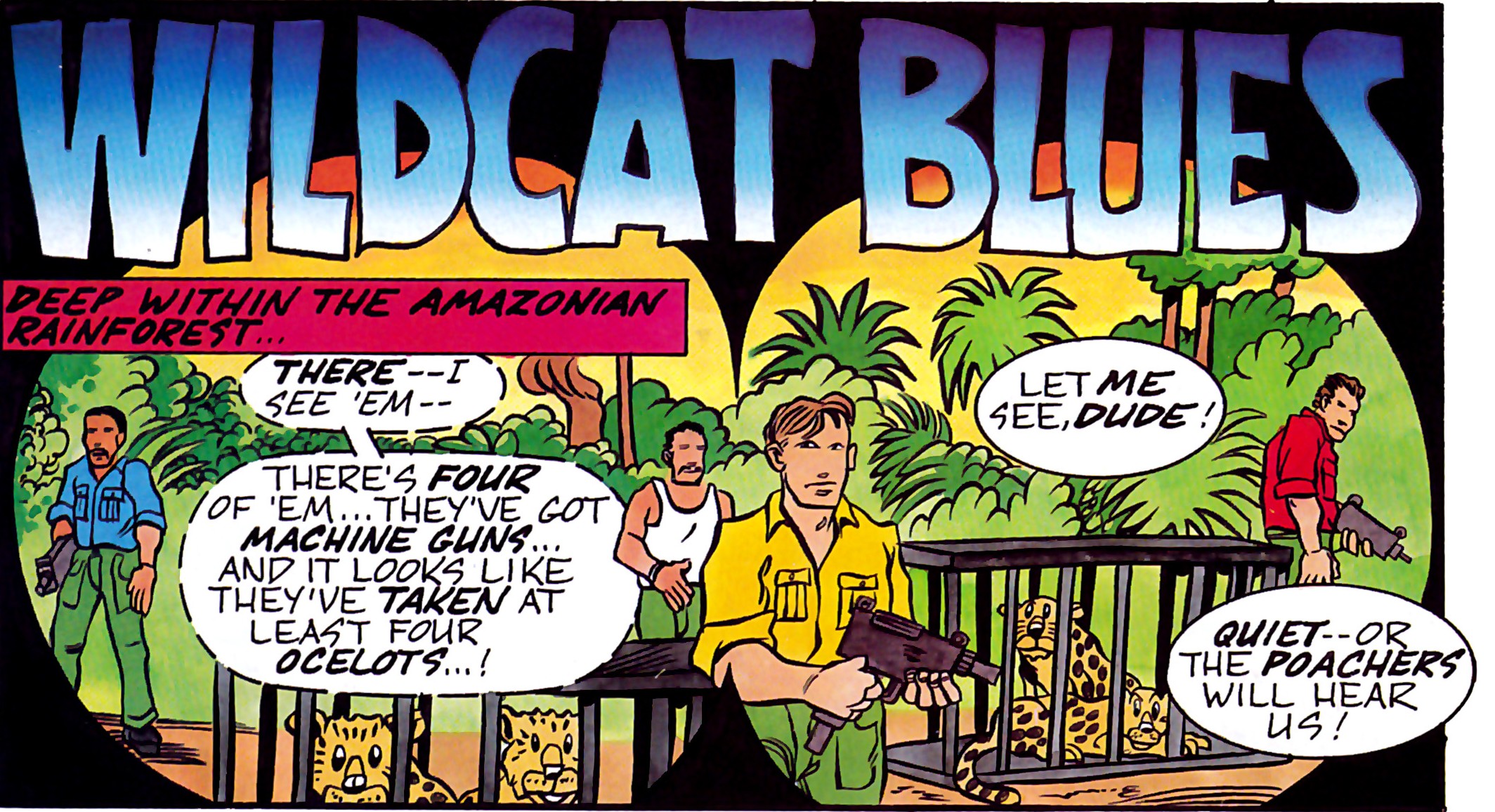 Les tortues poursuivaient leur périple en forêt amazonienne jusqu’à arriver à un camp de braconniers qui venaient de capturer des ocelots. Entendant des bruits dans les fourrés, les hommes tiraient à l’aveuglette, craignant qu’il s’agisse de policiers. Les mutants partaient se cacher, mais hélas ils venaient de perdre les braconniers de vue.