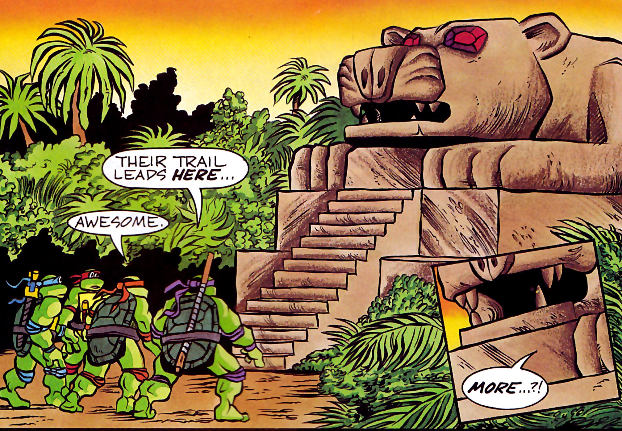 Poursuivant à travers la forêt vierge, à la recherche de ces hommes, les quatre frères arrivaient bientôt au niveau de ruines d’un temple représentant un jaguar géant. S’avançant face au bâtiment, les ninjas étaient surpris par un félin qui leur sautait dessus. Celui-ci était enragé, exténué de devoir affronter les humains et leur barbarie. Mais les tortues essayaient de le raisonner. Il s’agissait de leur vieil ami Jagwar !