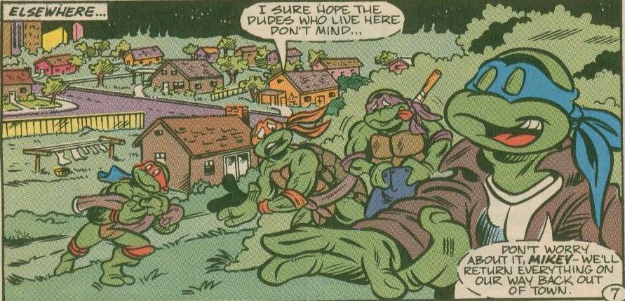 Cudley recrachait les tortues non loin d’une forêt. Si les mutants trouvaient le lieu absolument magnifique, Michaelangelo ne comprenait pas très bien ce qu’ils faisaient là. Rien à voir avec New York…