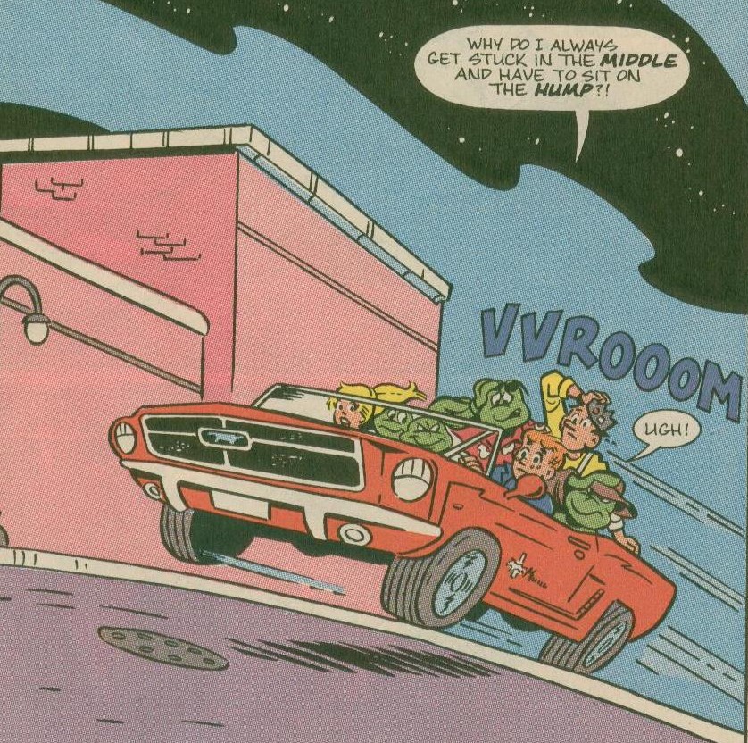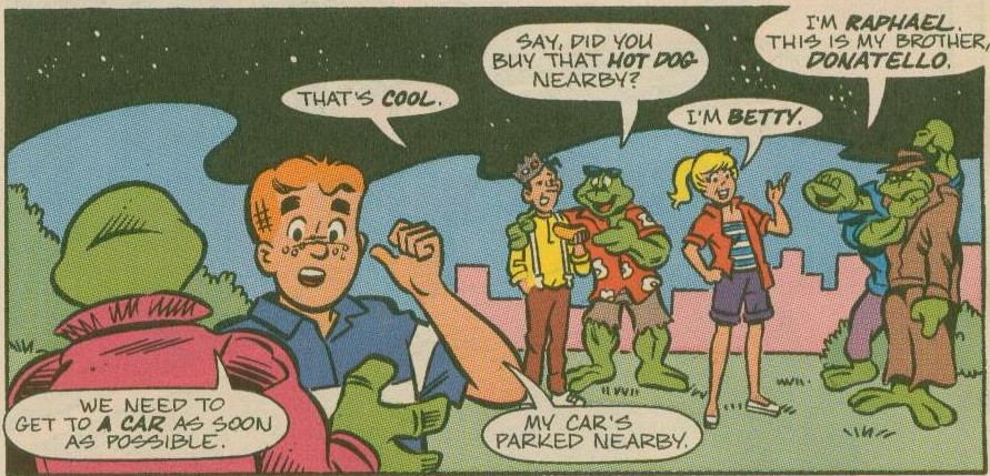 L’arrivée des quatre tortues n’était pas passée inaperçue, puisqu’Archie et sa compagne, qui s’étaient isolés pour avoir un petit peu d’intimité, les avaient surpris. Ils s’empressaient de rentrer à Riverdale pour en avertir les citoyens. Ils avaient vus des extraterrestres ! Personne ne les croyait…