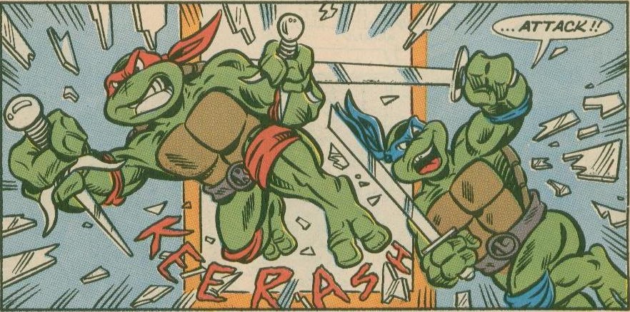 L’un de leurs amis se fit passer pour un livreur de pizzas et vint frapper à la porte de la chambre. Les ravisseurs pensaient qu’il s’agissait du père de Veronica, qui apportait la rançon. Pendant ce temps, les tortues traversaient la fenêtre arrière pour délivrer la jeune femme. Les deux hommes ne firent pas long feu contre les ninjas. Tout était bien qui finissait bien.