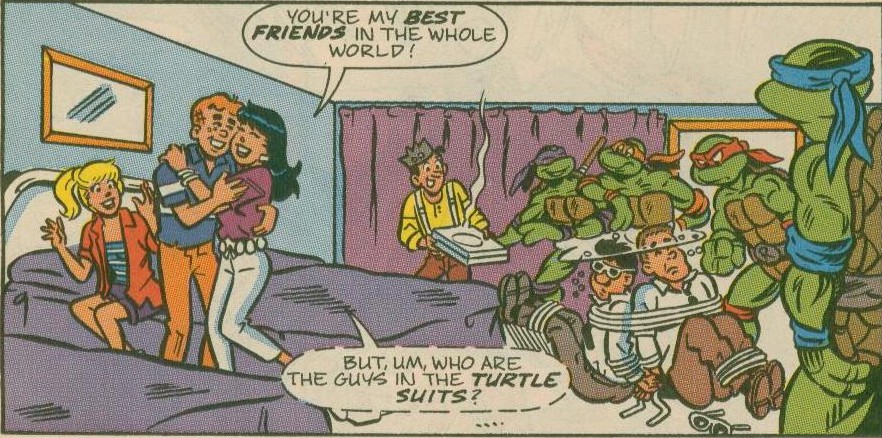 Les tortues, qui venaient d’arriver dans la fête, assistaient à la scène sans pouvoir intervenir. Archie et ses amis déboulaient au même moment. Les quatre ninjas, grotesquement déguisés, leurs expliquaient ce qu’ils avaient entendus. Ils étaient prêts à les aider. Les adolescents se rendaient compte qu’ils ne parlaient pas à des humains. Ils les prenaient pour des extraterrestres. Ne voulant pas se perdre dans de trop longues et ennuyeuses explications, les tortues préféraient rentrer dans leur jeu et se proposaient de les aider à retrouver leur amie qui s’était très certainement faite enlever.