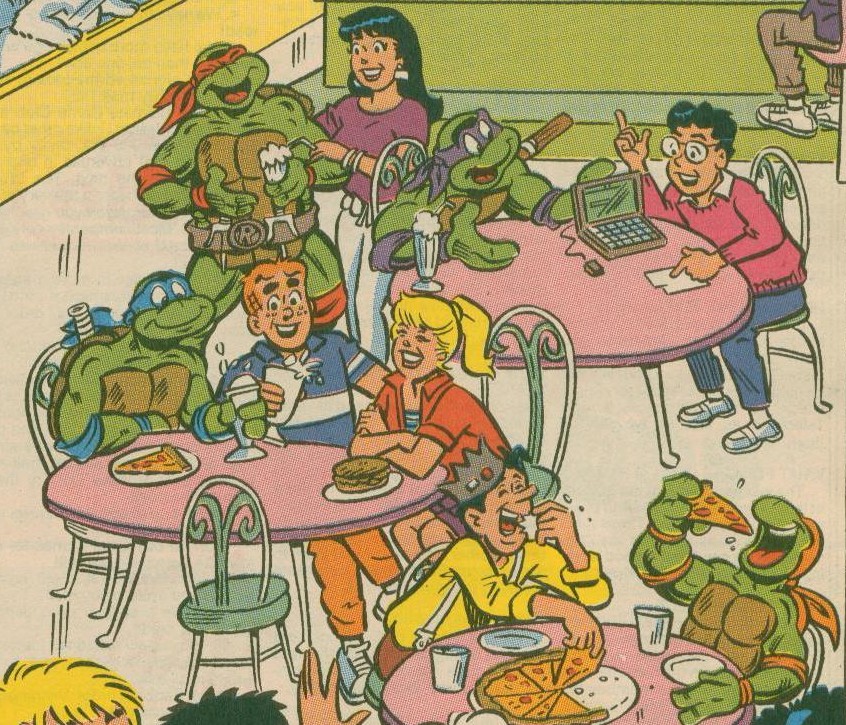 • Cet épisode se place dans un recueil d’aventures du nom de TMNT meet Archie. Archibald « Archie » Andrews est le héros d’un comic créé en 1941 par John L. Goldwater, Vic Bloom et Bob Montana, publié chez le jeune éditeur MJL. Face à sa popularité, le comic obtient sa propre série, du nom d’Archie Comics, dès l’année suivante. En 1945, MJL reprend le nom d’Archie Comics, et renomme sa série simplement Archie. Il s’agit donc d’une série extrêmement ancienne et fondatrice de l’éditeur lui-même.