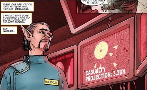 Honeycutt voulait à tous prix protéger sa famille et les rejoindre. Hélas, la sécurité automatique du laboratoire avait enclenché un système de fermeture des sas avec la partie habitable du bâtiment. Les neutrinos qui s’y trouvaient risquaient tous de périr dans les flammes. Malgré le danger, le professeur voulait sauver sa femme et son enfant. Il transférait son esprit dans SAL afin de pouvoir traverser les parties périlleuses du bunker. Mais il y avait un prix à cela. Le feu gagnait très vite du terrain et le laboratoire serait la proie des flammes. Honeycutt allait être piégé à jamais dans le corps en métal. Le prix en valait la peine. Le robot se précipitait en salle de contrôle du bâtiment et ouvrait les portes de sorties auxquelles étaient amassés les civils qui voulaient s’échapper de cet enfer. Malheureusement, une fois à l’extérieur, ils étaient les cibles des vaisseaux. Les bombes pleuvaient. Honeycutt voyait la tragédie depuis les caméras de sécurité de la salle de contrôle. Sa famille se faisait pulvériser sous ses yeux.