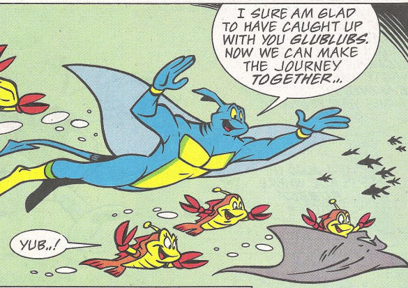 À peine les deux créatures marines avaient-elles faites connaissances que les glublubs étaient encerclés de requins. Armaggon s’était relevé et avait appelé quelques-uns de ses semblables « sous évolués » pour lui venir en aide. Le plus étrange était que le requin connaissait son nom. Il semblait l’avoir déjà affronté. L’homme poisson se ruait sur son nouvel ennemi pour essayer d’en savoir plus. Le combat faisait rage entre les deux mutants jusqu’à ce qu’Armaggon dévoile son mystère : il venait du futur ! Il avait déjà eu l’occasion d’affronter Man Ray à de nombreuses reprises. Merdude vint en aide à son nouvel ami et essaya de rattraper le requin qui partait à travers un portail sombre, poussant un caddie de tout un tas de restes métalliques qu’il avait collecté. Mais sur le point de changer de temporalité, le requin saisit le seigneur des mers pour l’emmener avec lui.