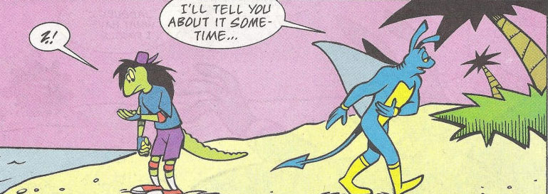 Man Ray sortait de l’eau et se dirigeait vers la plage où se trouvaient ses amis. Mondo Gecko s’approchait de lui pour lui montrer les trouvailles réalisées sur le sable. Il avait même découvert une dent de requin ! L’homme poisson lui donnait plusieurs de ces mêmes dents avant de poursuivre sa route sans dire mot et furieux…