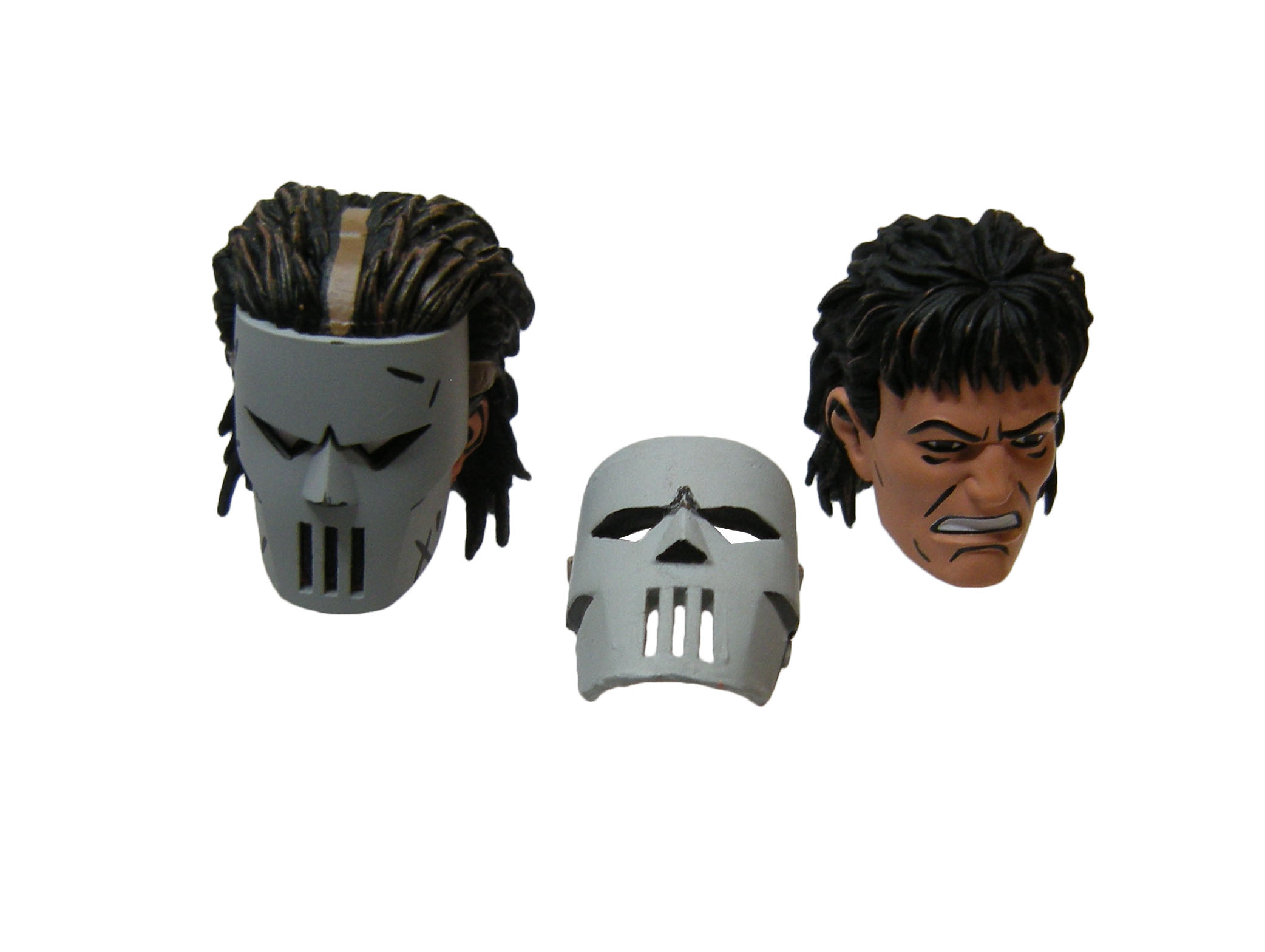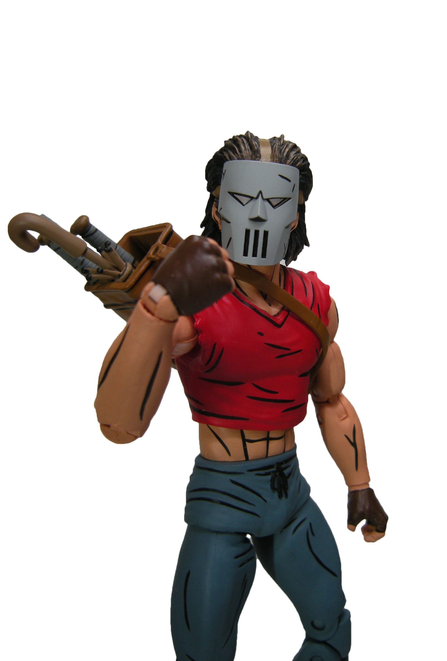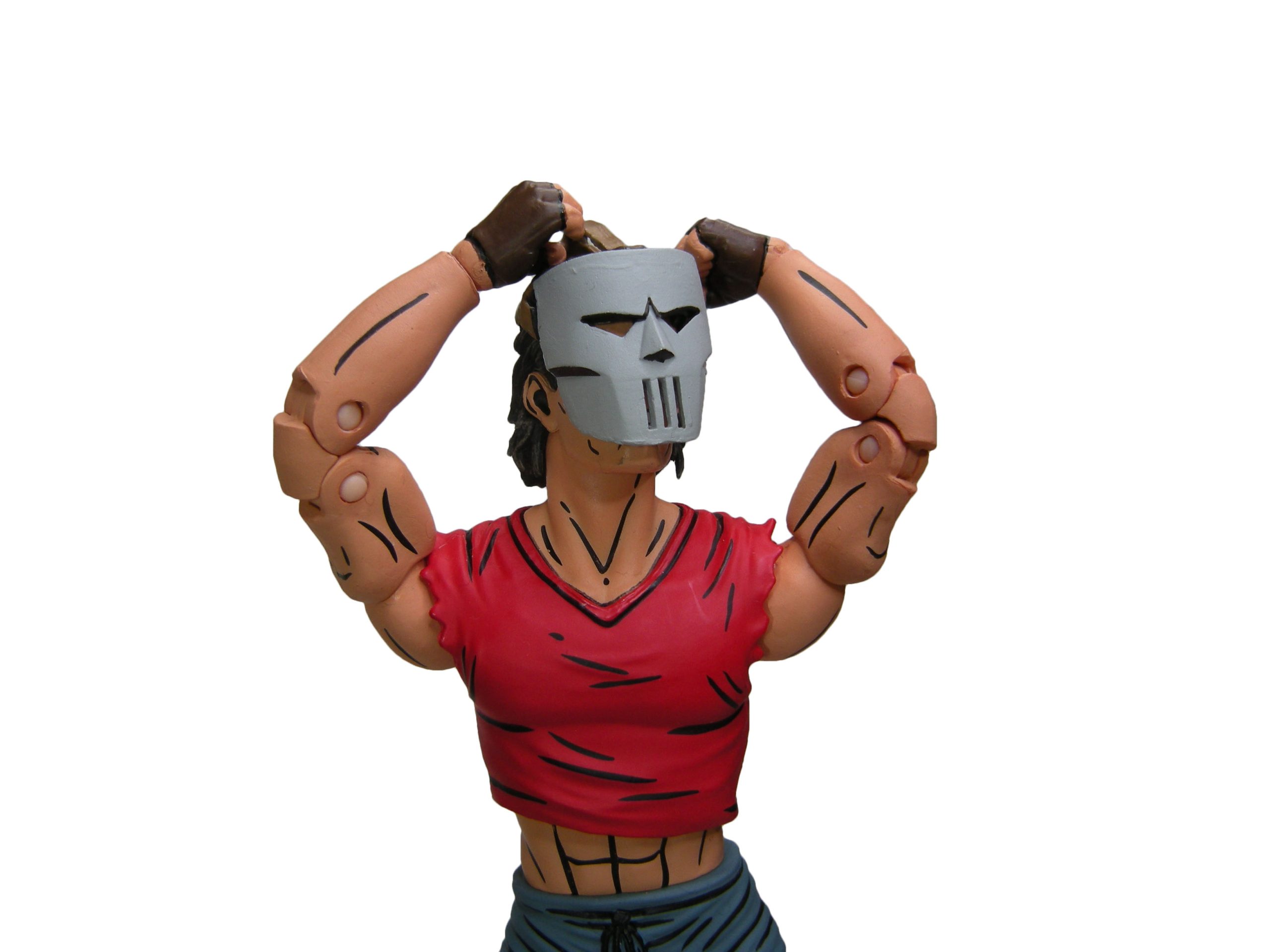 La version sans masque est assez fidèle au personnage du comic de Mirage, sous le crayon de Kevin Eastman. J’ai un petit peu de mal avec l’aspect de ce visage colérique. Il exprime quelque chose de trop statique. On dirait que Casey est constipé depuis une semaine ! Et surtout, je trouve qu’il ressemble beaucoup à celui d’Oroku Saki, avec des cheveux plus longs. Ce repaint aurait peut-être été l’occasion de nous offrir un nouveau visage.