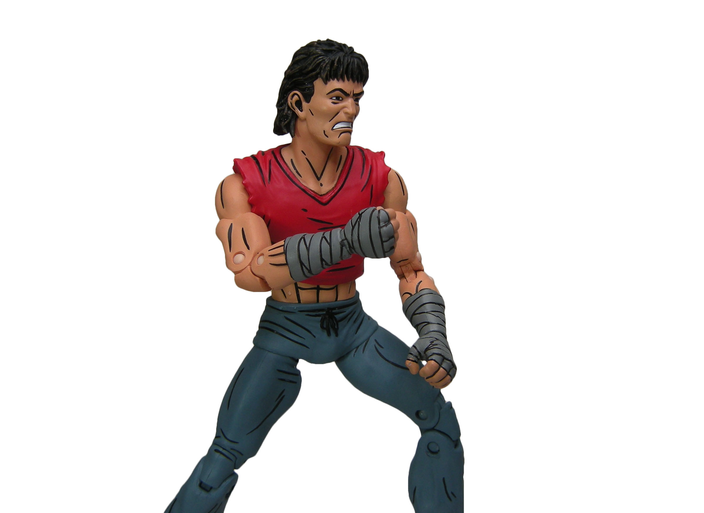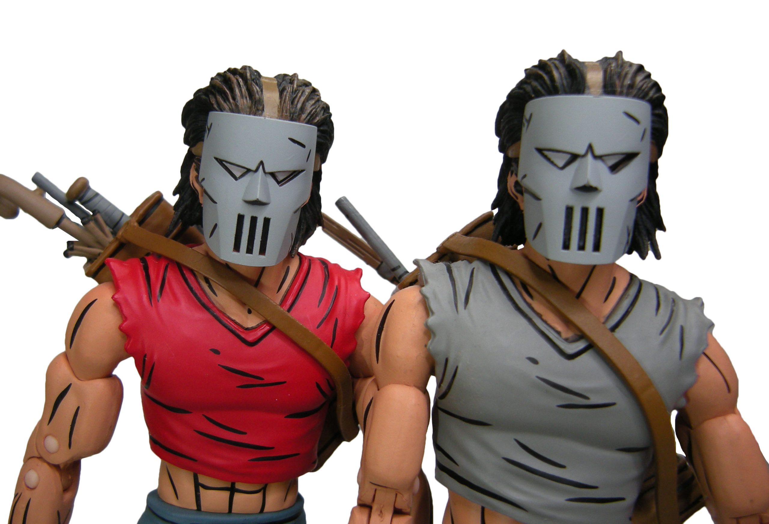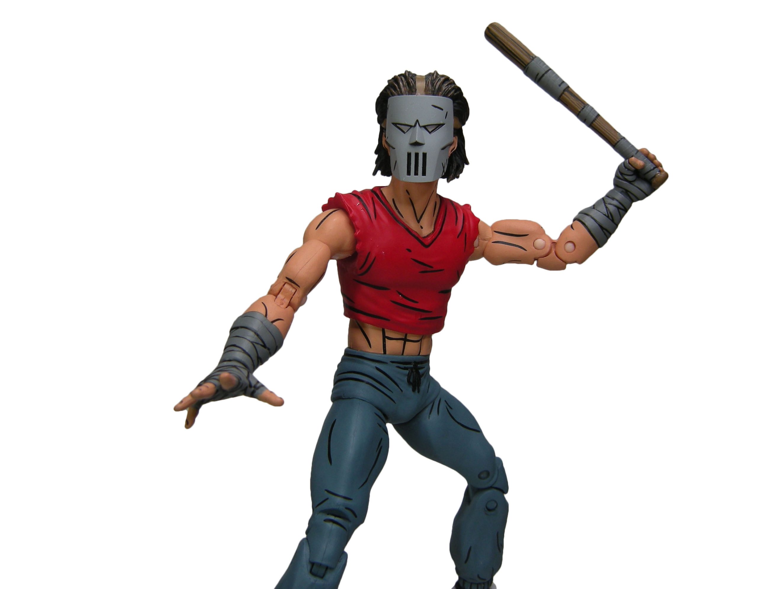 La version sans masque est assez fidèle au personnage du comic de Mirage, sous le crayon de Kevin Eastman. J’ai un petit peu de mal avec l’aspect de ce visage colérique. Il exprime quelque chose de trop statique. On dirait que Casey est constipé depuis une semaine ! Et surtout, je trouve qu’il ressemble beaucoup à celui d’Oroku Saki, avec des cheveux plus longs. Ce repaint aurait peut-être été l’occasion de nous offrir un nouveau visage.