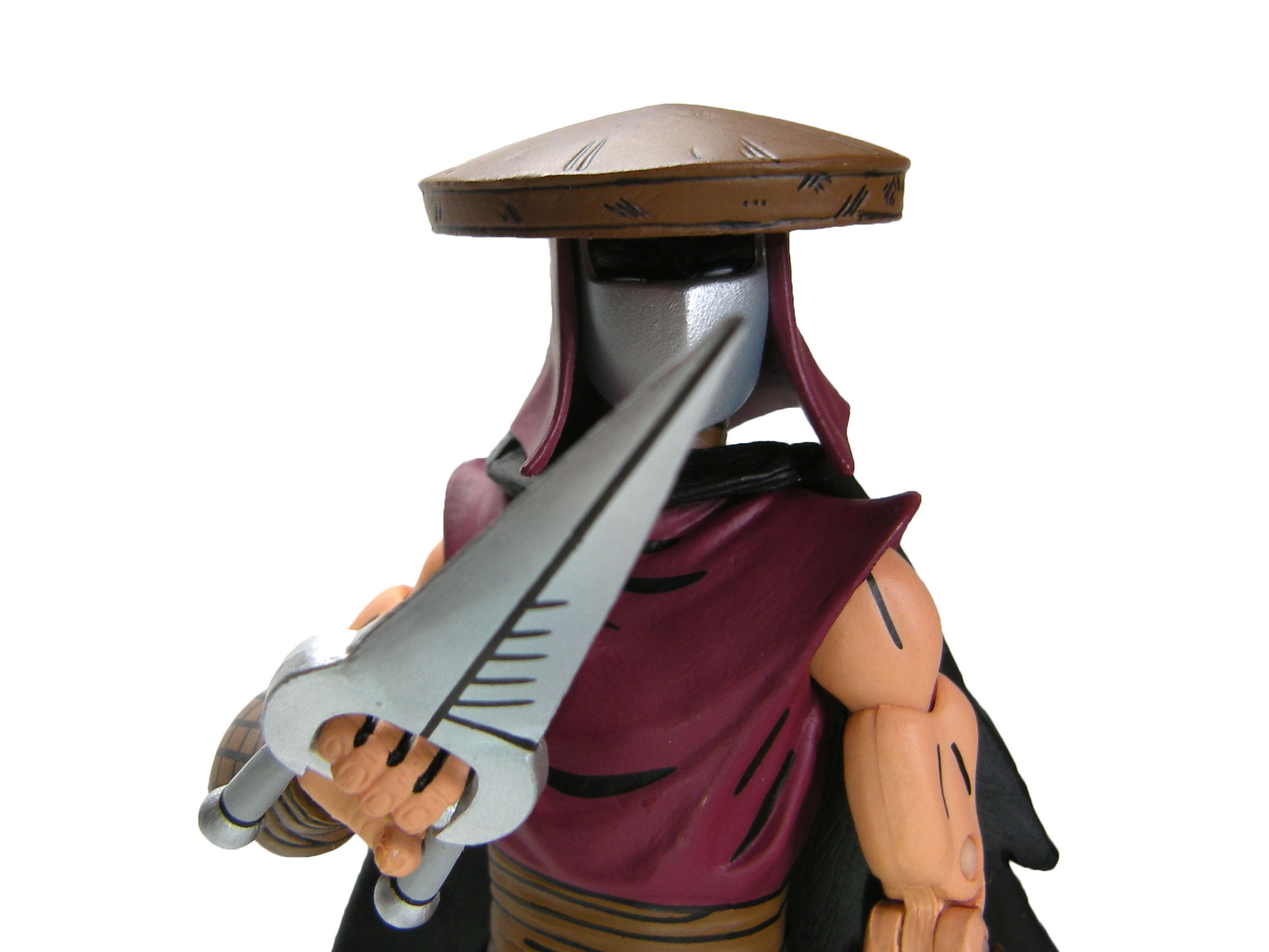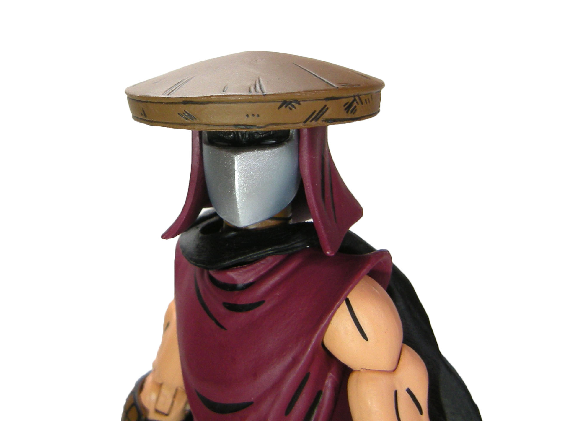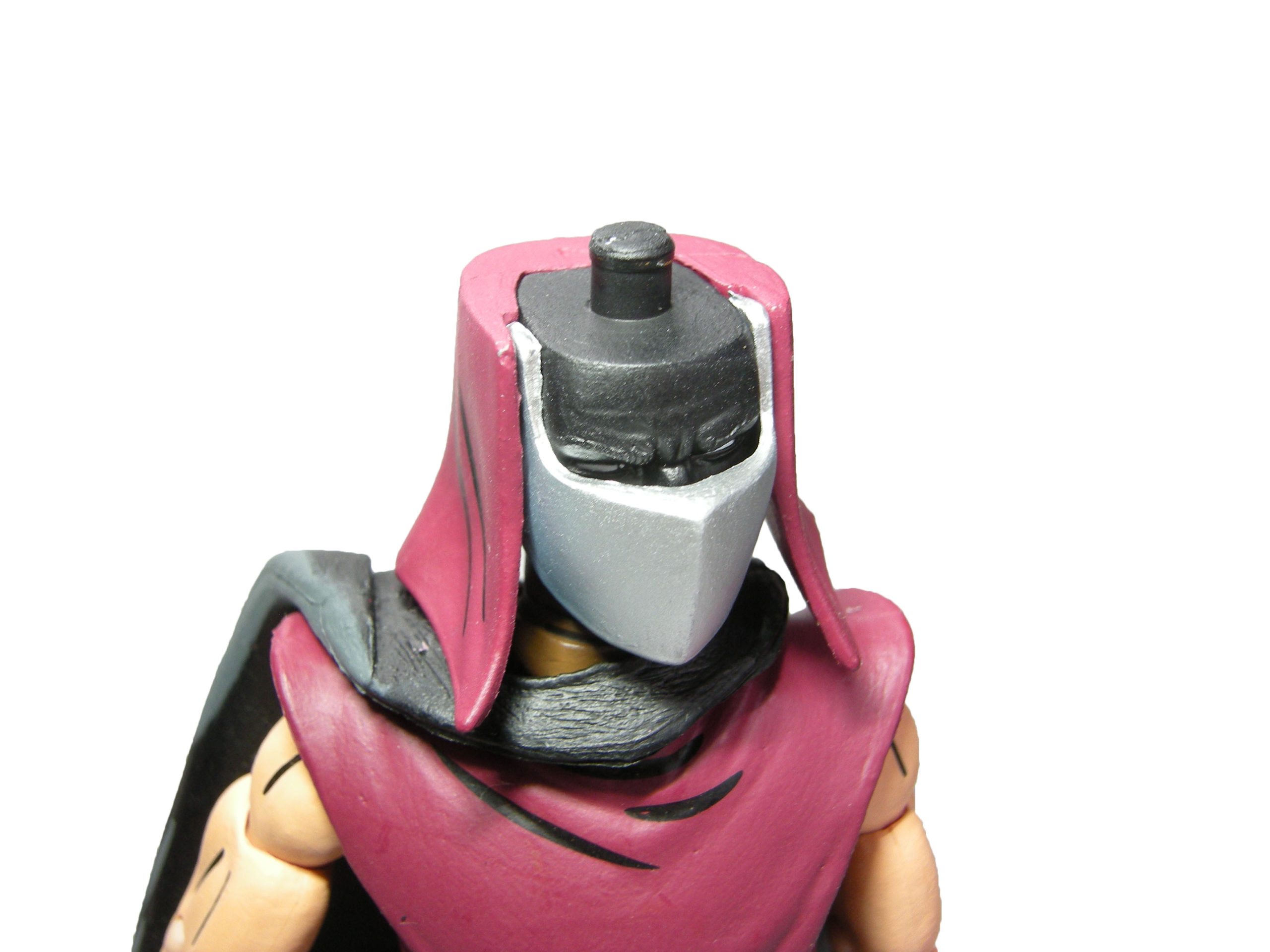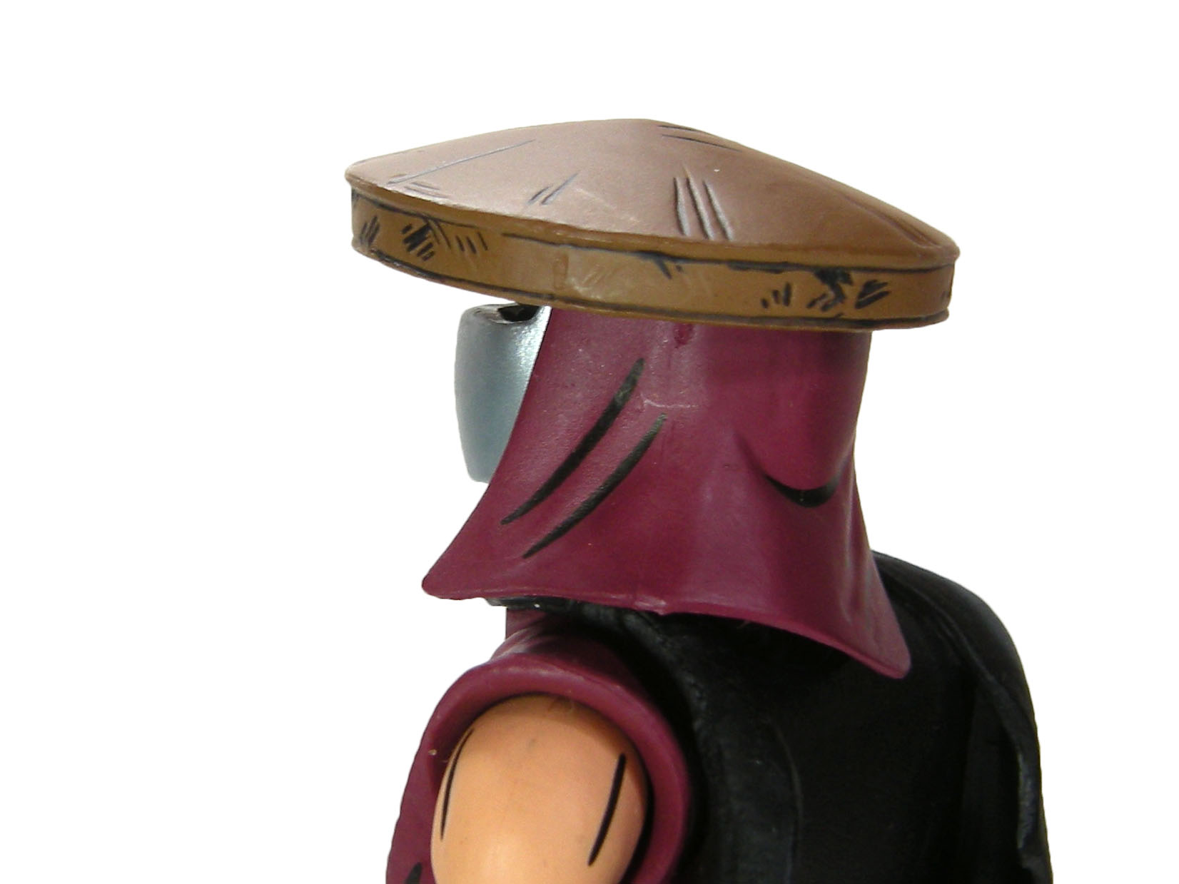Un visage se dessine derrière le masque. Bien que peint de noir, nous reconnaissons celui qui a été attribué à Shredder. Il est possible de retirer le masque, le chapeau et le tissu à l’arrière de son crâne pour le voir. La tête porte le fameux chapeau qui rend ces soldats d’élite tout à fait reconnaissables dans l’armée du Foot Clan. La nuque est quant à elle cachée par une pièce de tissu.