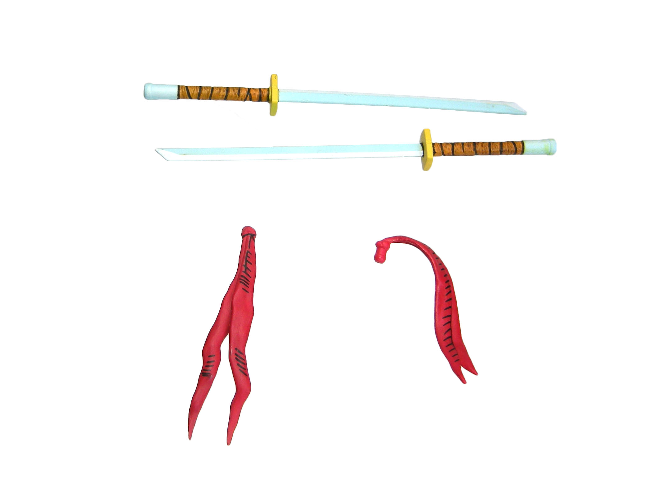 Les sabres de Leonardo sont tous les deux identiques. La lame est droite et fine. Hélas pas assez pour les ranger dans les fourreaux. Un frottement se fait ressentir sur mon exemplaire, ce qui laisse un transfert de peinture sur les lames. Ces épées sont différentes de celles du Leonardo sorti en 2008. Et contrairement à cette ancienne version, les pommeaux ne se retirent pas pour glisser les armes en main. Ce sabre a été repris par la suite sur la figurine du Wanderer.