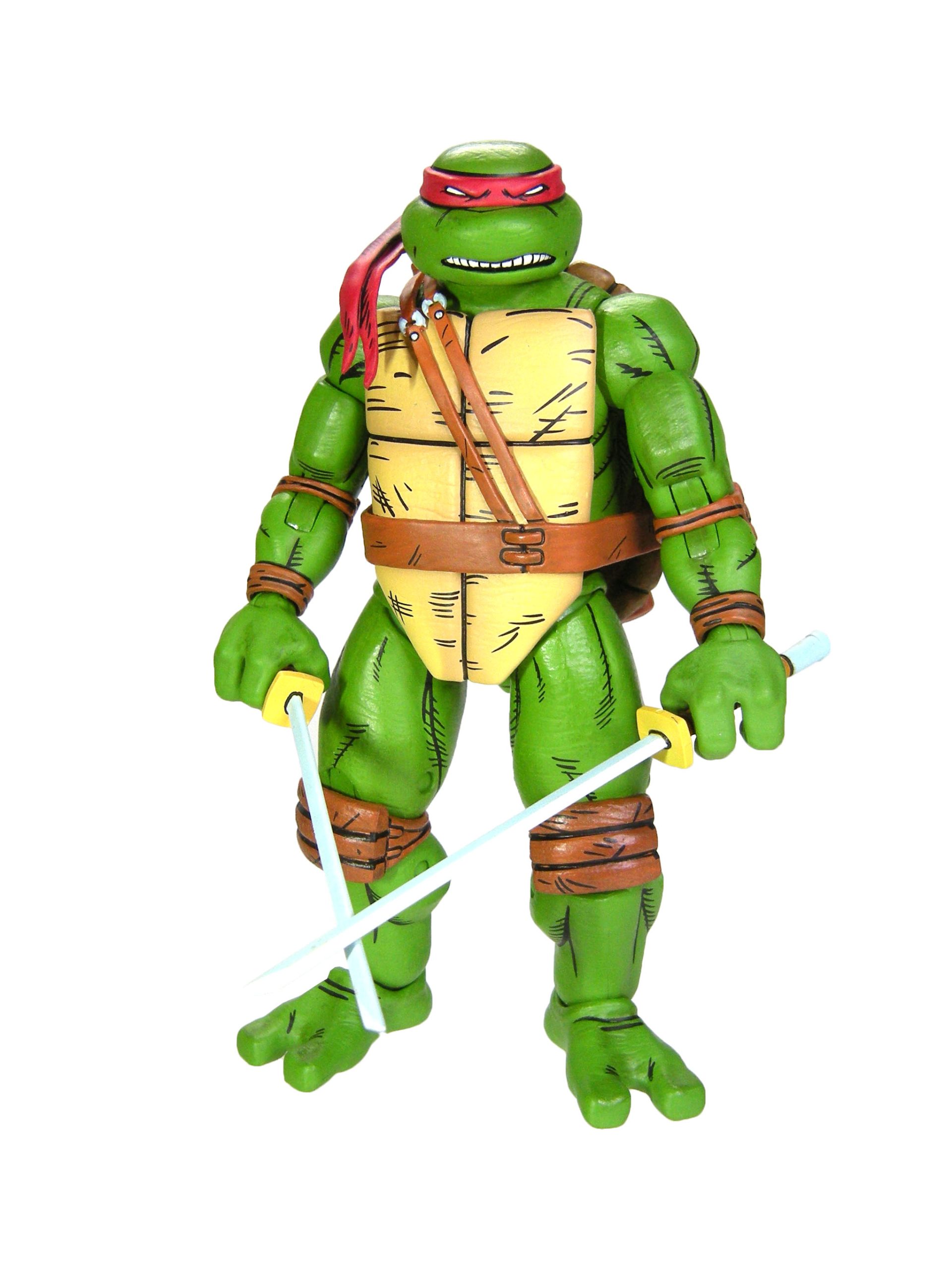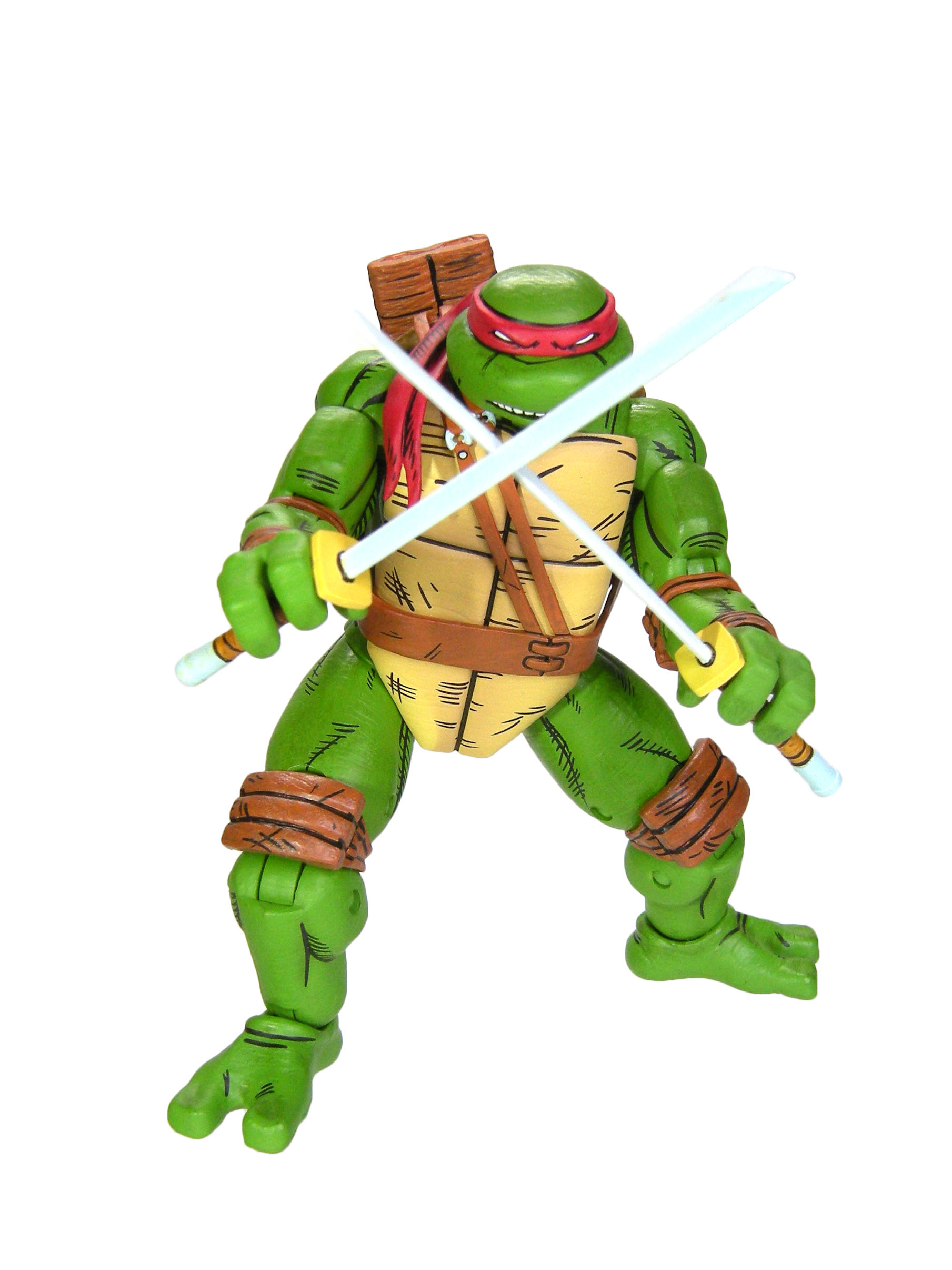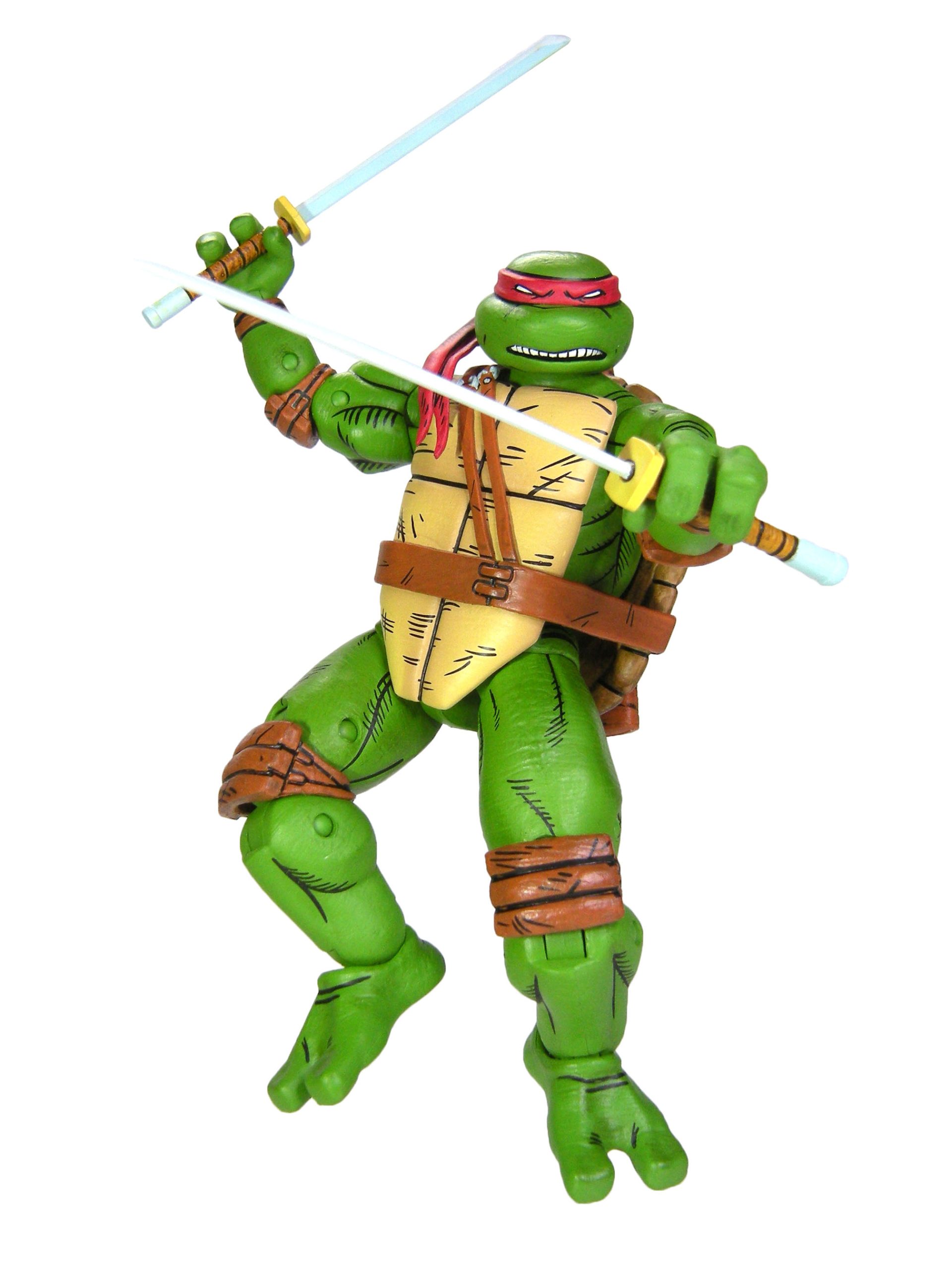 Dans sa version individuelle, nous retrouvons la tortue avec deux paires de mains interchangeables, une permettant de tenir des accessoires et une aux poings fermés, ainsi que deux bandeaux, deux sabres et trois shurikens. Ces accessoires étaient déjà présents dans le 4-pack. Néanmoins, nous retrouvons également quelques accessoires qui ne sont autres que des rééditions d’accessoires déjà sortis avec d’autres figurines de cette gamme.