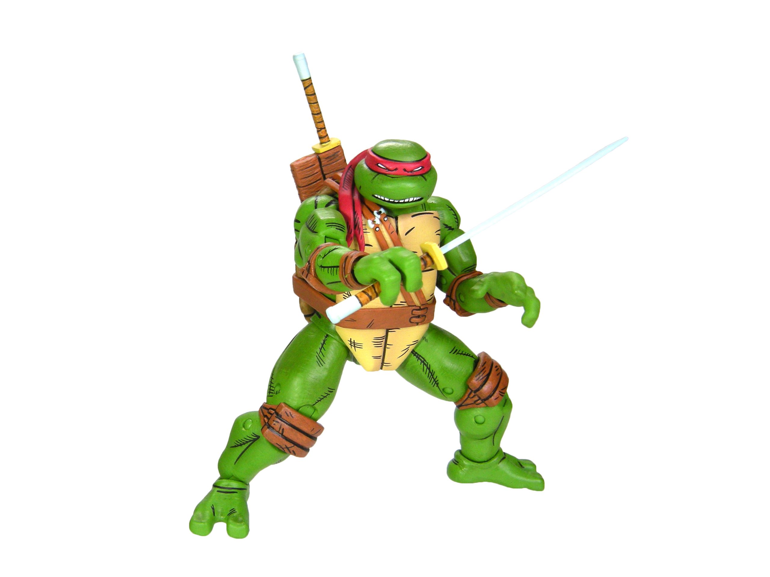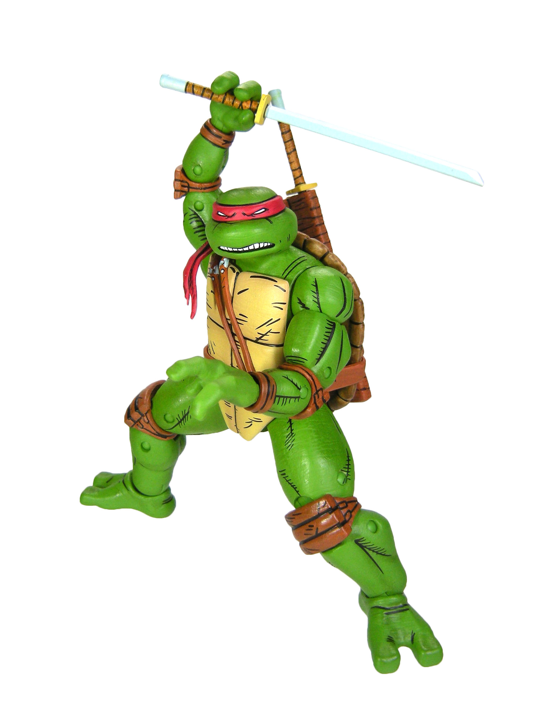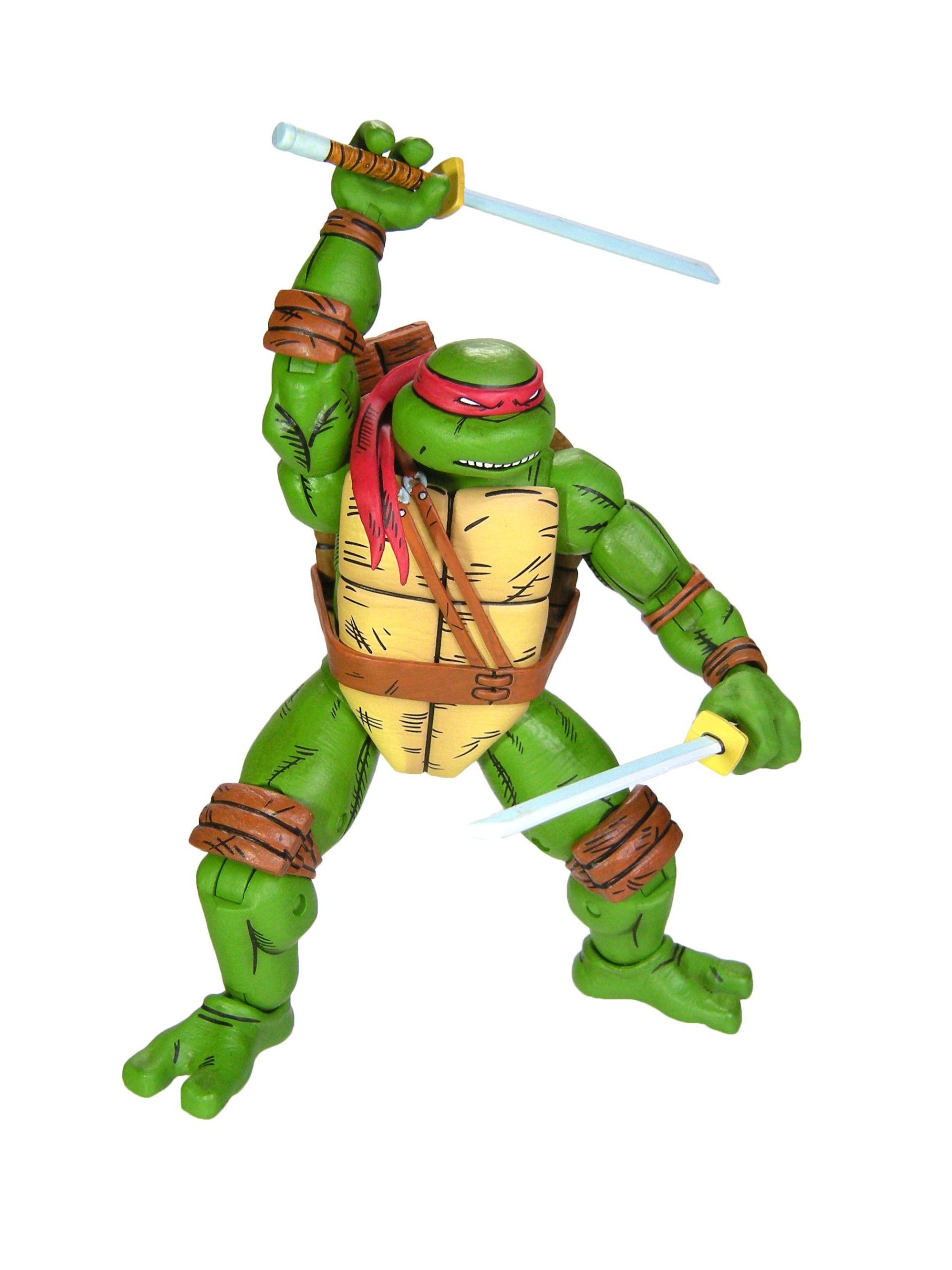 Dans sa version individuelle, nous retrouvons la tortue avec deux paires de mains interchangeables, une permettant de tenir des accessoires et une aux poings fermés, ainsi que deux bandeaux, deux sabres et trois shurikens. Ces accessoires étaient déjà présents dans le 4-pack. Néanmoins, nous retrouvons également quelques accessoires qui ne sont autres que des rééditions d’accessoires déjà sortis avec d’autres figurines de cette gamme.