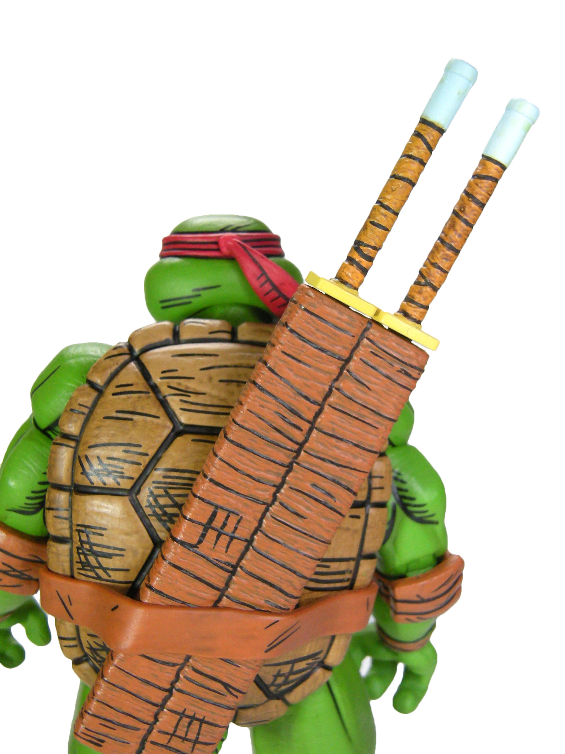 Les fourreaux sont fixés à la carapace à l’aide d’un large peg, à l’instar de Donatello. Sur les deux autres tortues, le trou est colmaté par une petite plaque, sous la ceinture. La ceinture et les lanières transversales sont réalisées dans un plastique souple. À l’avant, la ceinture présente les deux cordes qui permettent de la refermer. Le plastron comme la carapace sont perforés pour accueillir des tiges de fixation de la ceinture.