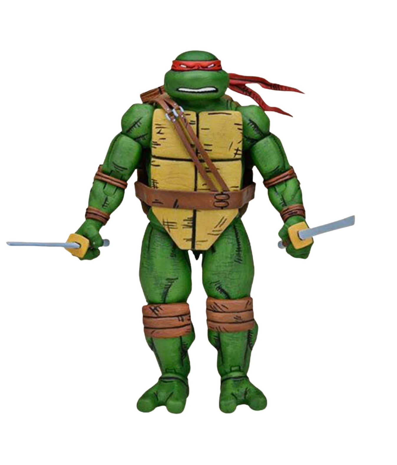Notre tortue possède des membres très massifs. Épais, mais aussi remarquablement sculptés. La peau semble comme très légèrement texturée. Le rendu très délicat est largement embelli par la peinture. Une fois en main, la figurine a l’air bien plus solide que les tortues sorties en 2008 chez NECA. Nous retrouvons l’utilisation habituelle de deux plastiques différents, un rigide pour l’ensemble du corps et un plus souple dédié à certaines zones précises. Le bandeau, les protections des coudes et des genoux et la ceinture d’une part et une membrane destinée à cacher les articulations du bassin, sous le plastron. Cette dernière est très bien pensée, ne gêne en rien la mobilité du personnage et dissimule effectivement le vide laissé par la rotule.