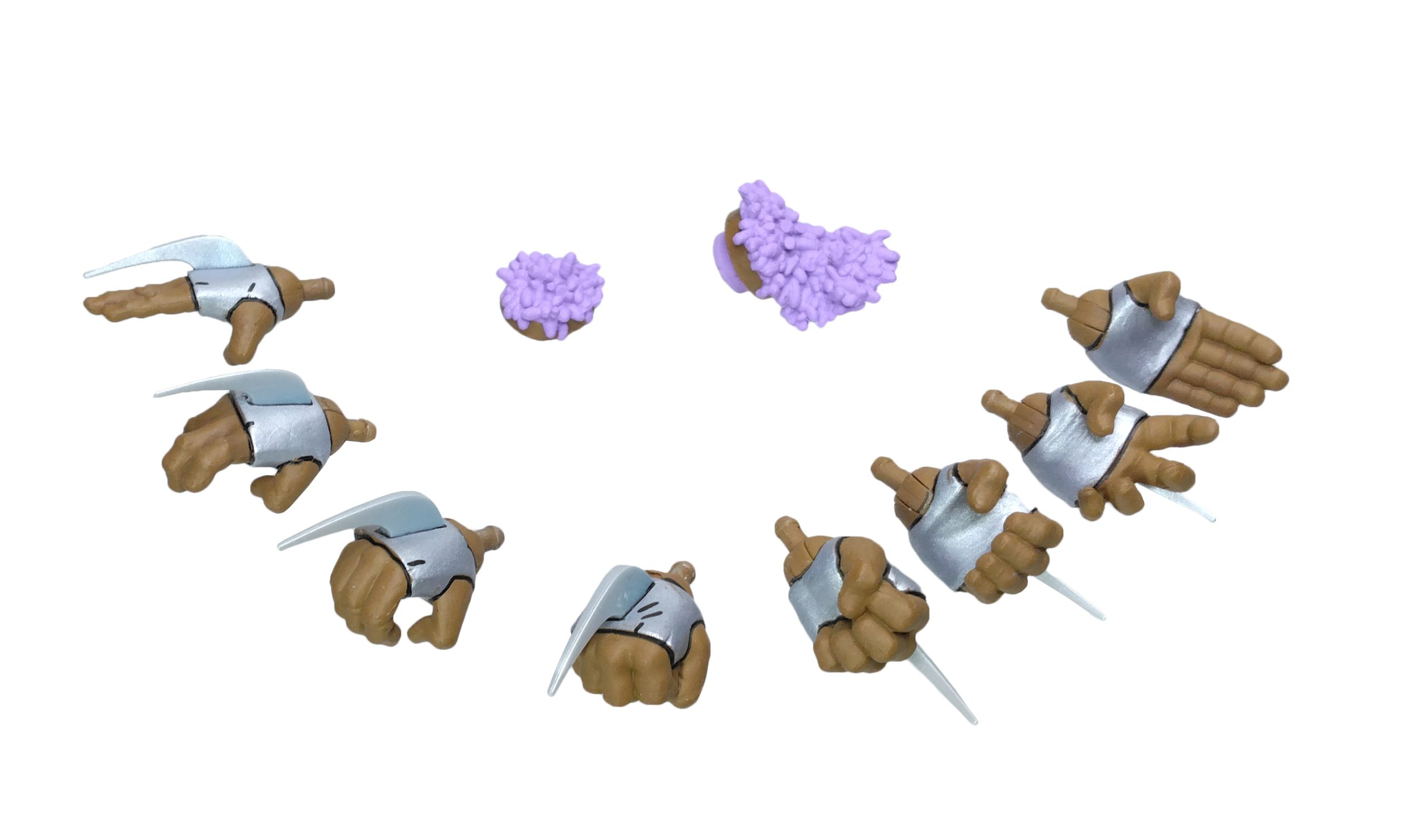 Les différentes mains permettent de varier facilement l’aspect de la figurine. Couplé aux nombreuses possibilités d’articulations que confèrent ces deux paires de bras, il y a de quoi faire ! Nous retrouvons ici une paire de mains aux poings fermés. Une paire aux doigts permettant de tenir des accessoires. Une paire aux doigts écartés et enfin une paire aux doigts entièrement ouverts, paume à plat.