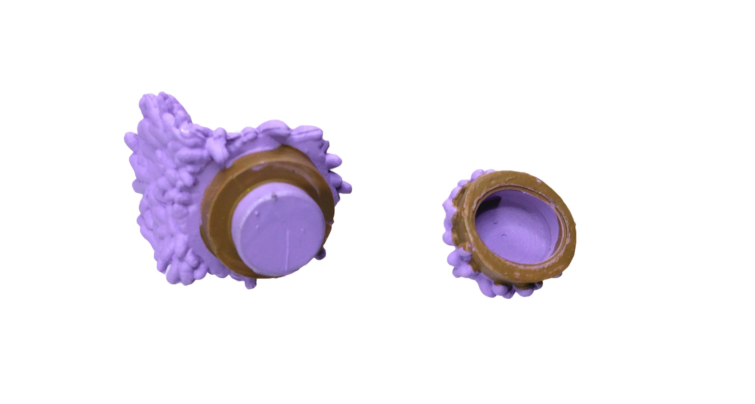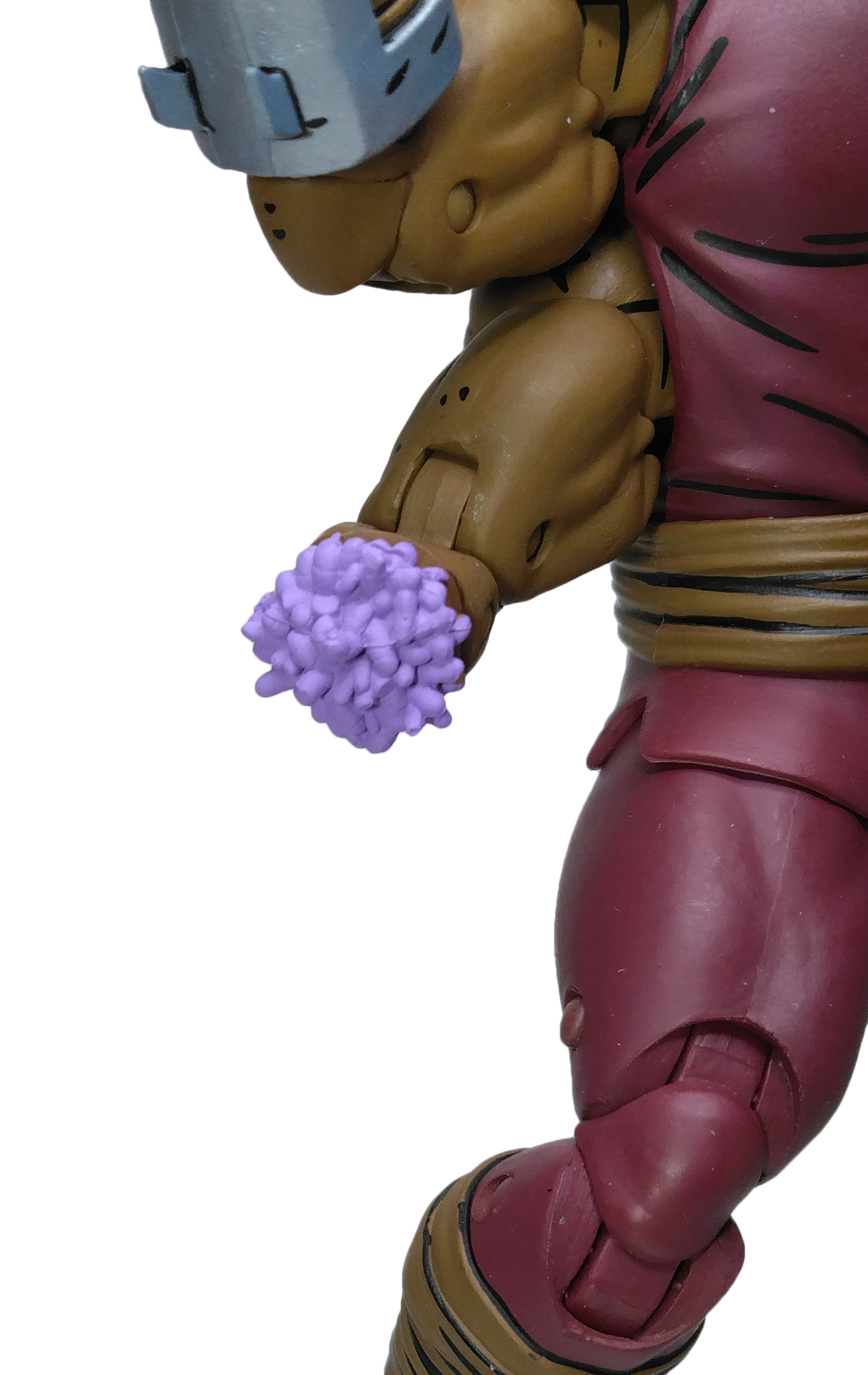 Les deux étranges accessoires mauves sont les vers issus des blessures infligées au colosse par les tortues durant leur combat. Ce n’est pas forcément un élément très flagrant au premier abord. NECA a glissé un visuel à l’arrière du blister. En l’absence d’autres gros accessoires, je trouve que c’est une excellente idée. Il vous suffit de retirer les bras de votre figurine et d’y fixer ces blessures.