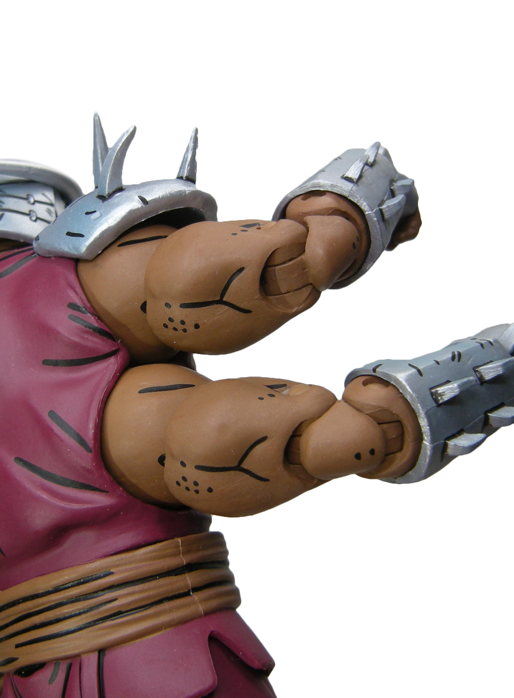 La peinture est comme toujours très bonne pour ces figurines. Je suis d’ailleurs très content de voir que pour une rare fois, NECA a opté pour conserver la coloration de Mirage, et non celles des Color classics d’IDW Publishing. Nos deux mutants disposent, comme le Claw Shredder, d’un vêtement aux tons rouges bordeaux, comme devait l’être Shredder et les Foot soldiers à l’origine.