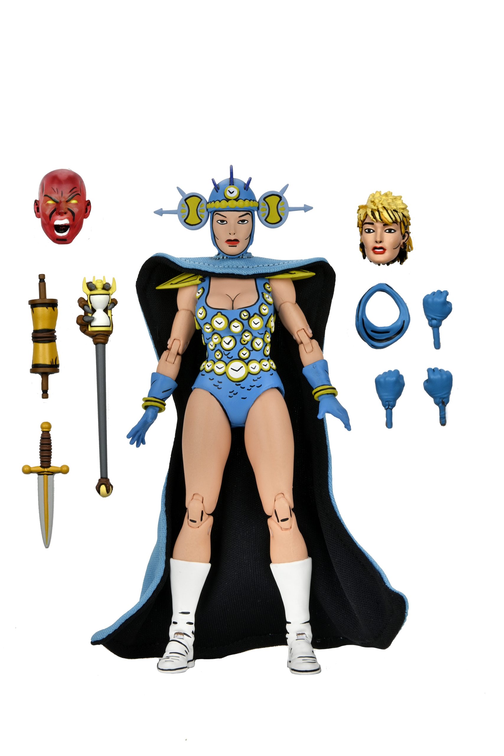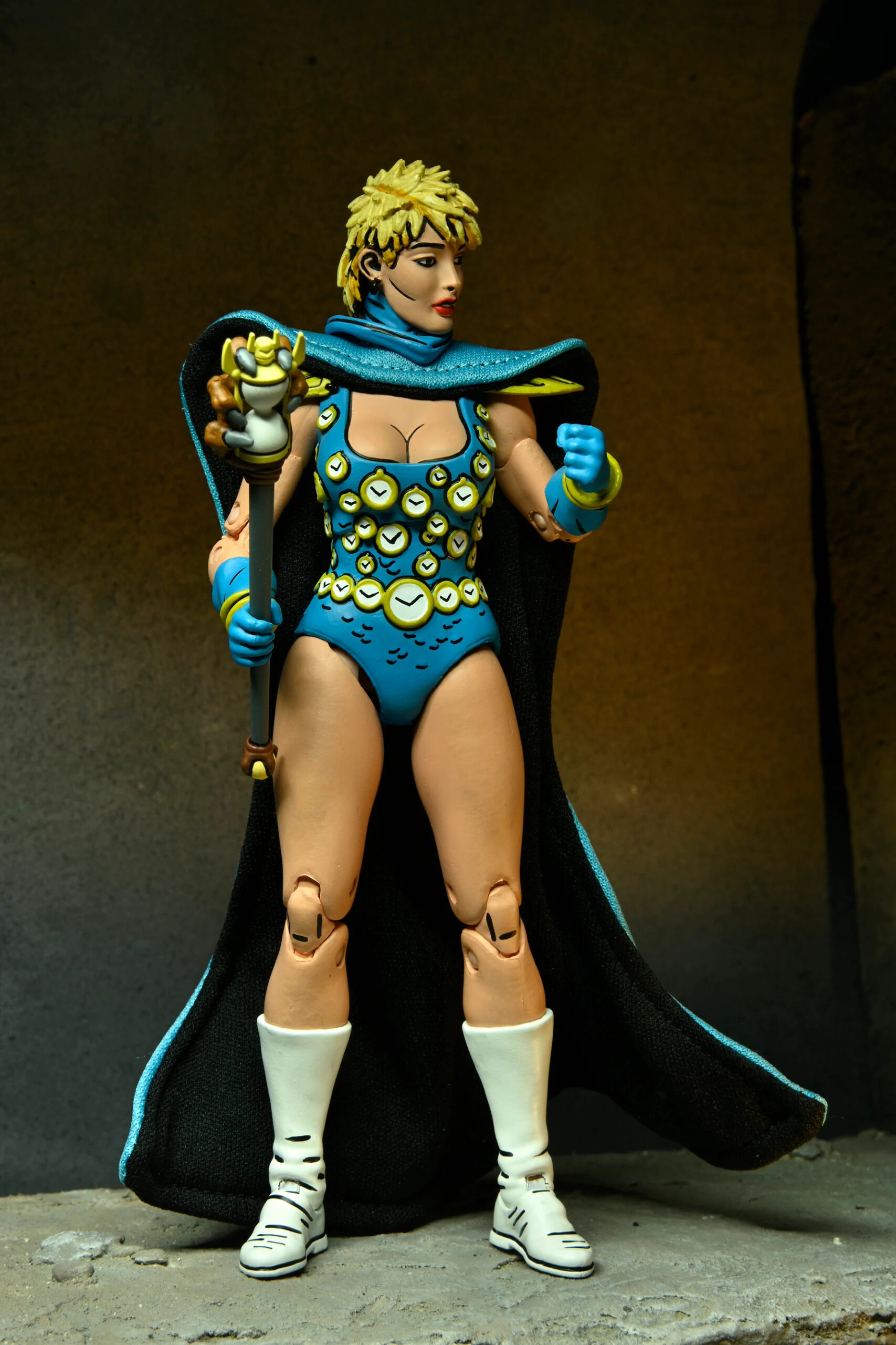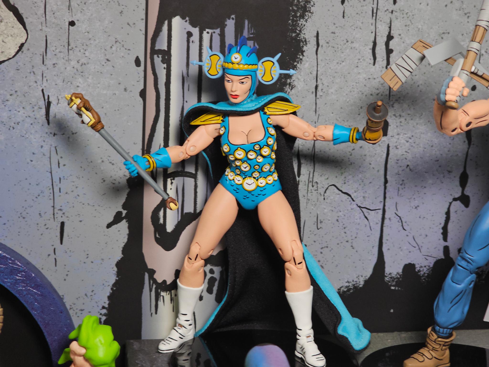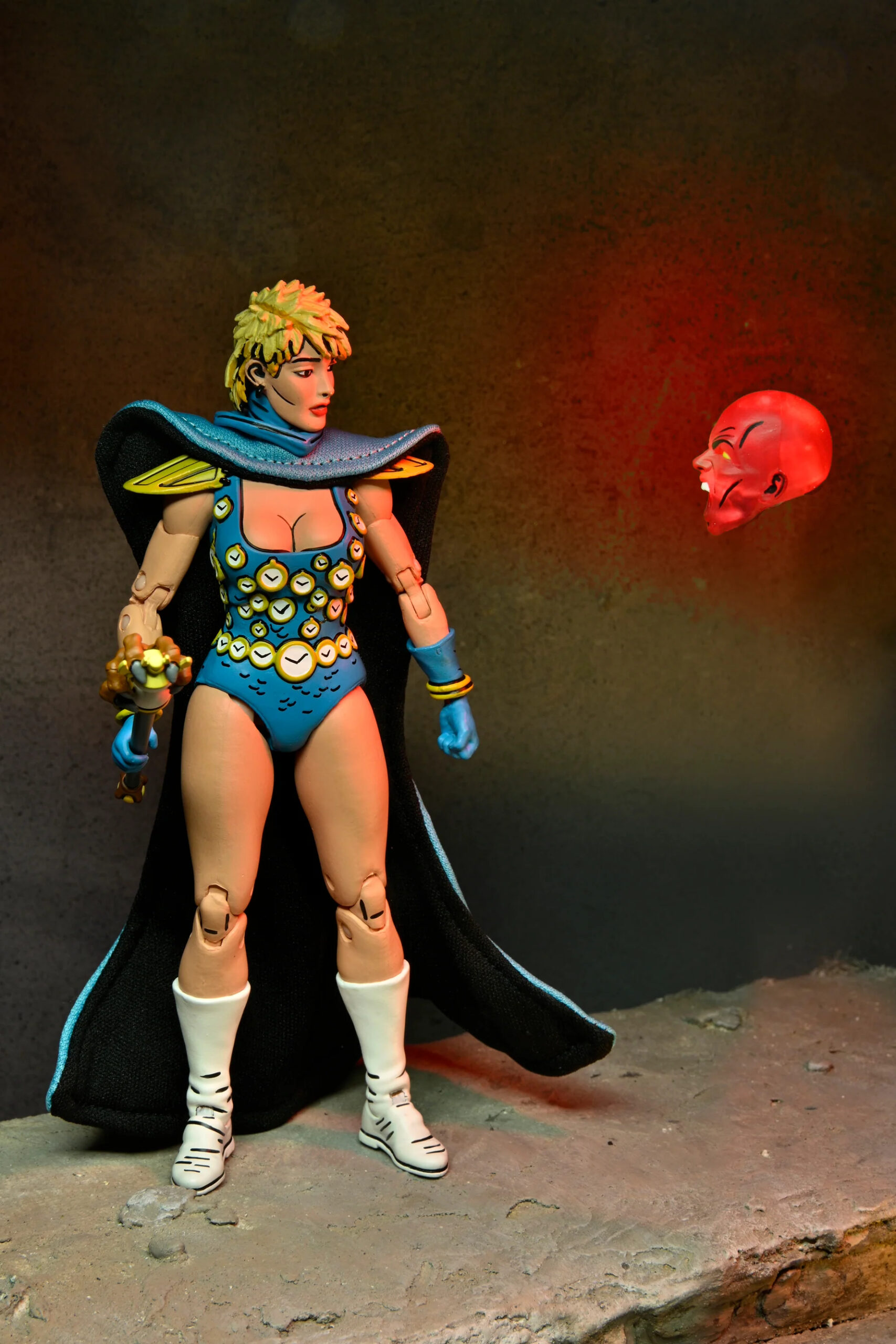 Outre les accessoires classiques, Renet possède un nombre intéressant d’objets de petite taille. À commencer par le sceptre du temps. Cet artefact est très finement sculpté et de toute beauté, avec cette main griffue qui s’empare du sablier en son centre. Il va parfaitement entre les mains de Renet. L’année suivante, NECA a réalisé Savanti Romero. Le personnage, très grand, était également accompagné d’un sceptre issu du même numéro. Mais dont les dimensions ont largement été revues à la hausse pour correspondre à son échelle (peut-être disproportionnée ?). Les finitions sont également bien moins bonnes que pour le sceptre de Renet, sans oublier les peintures.