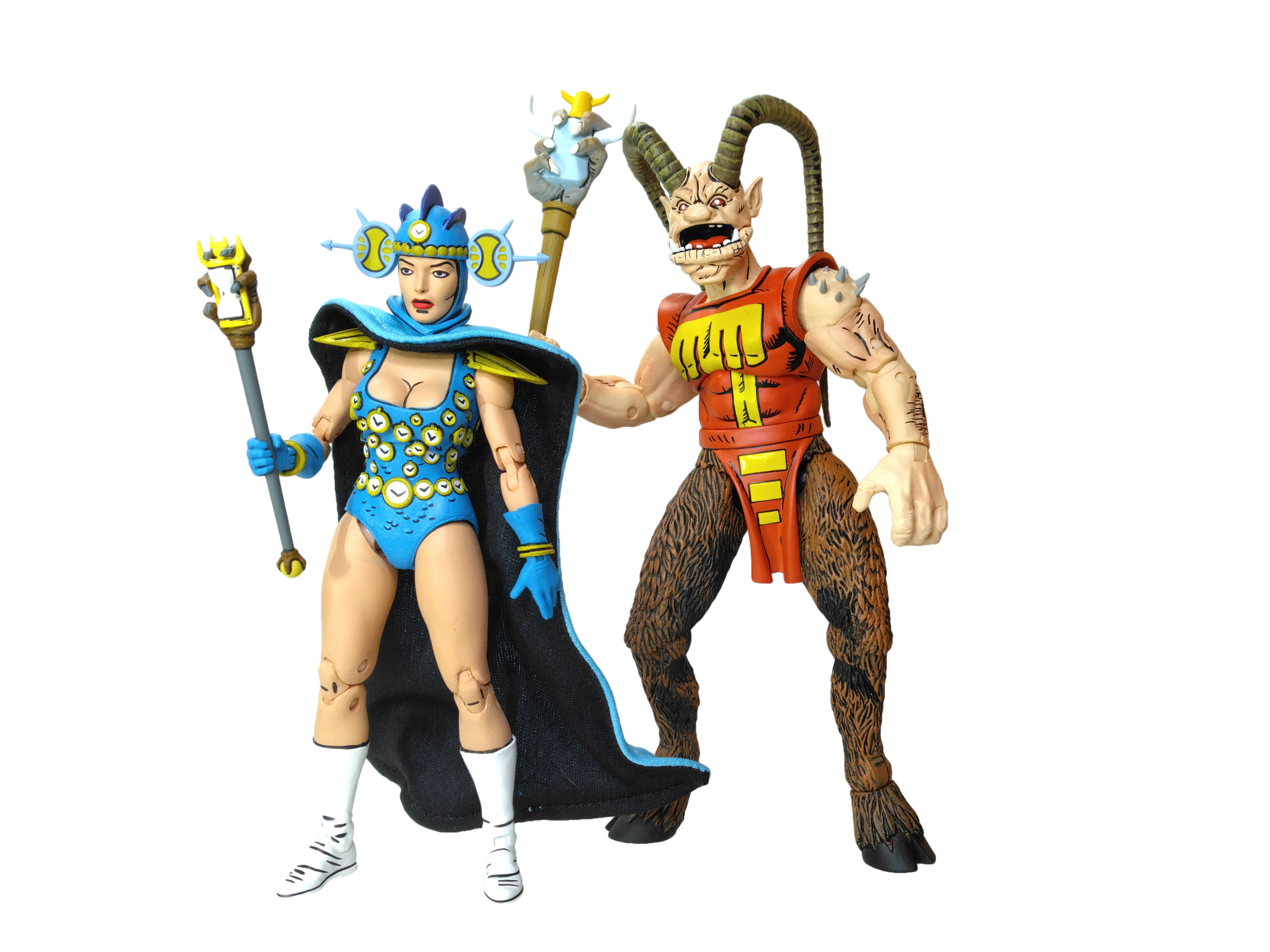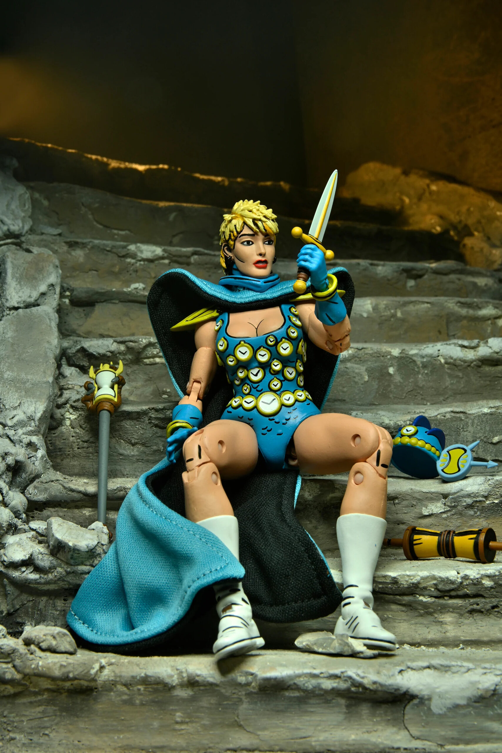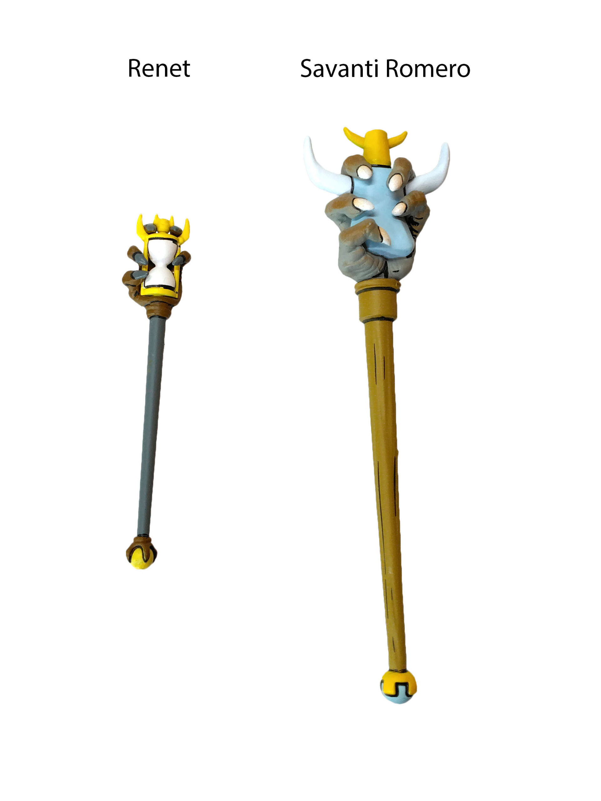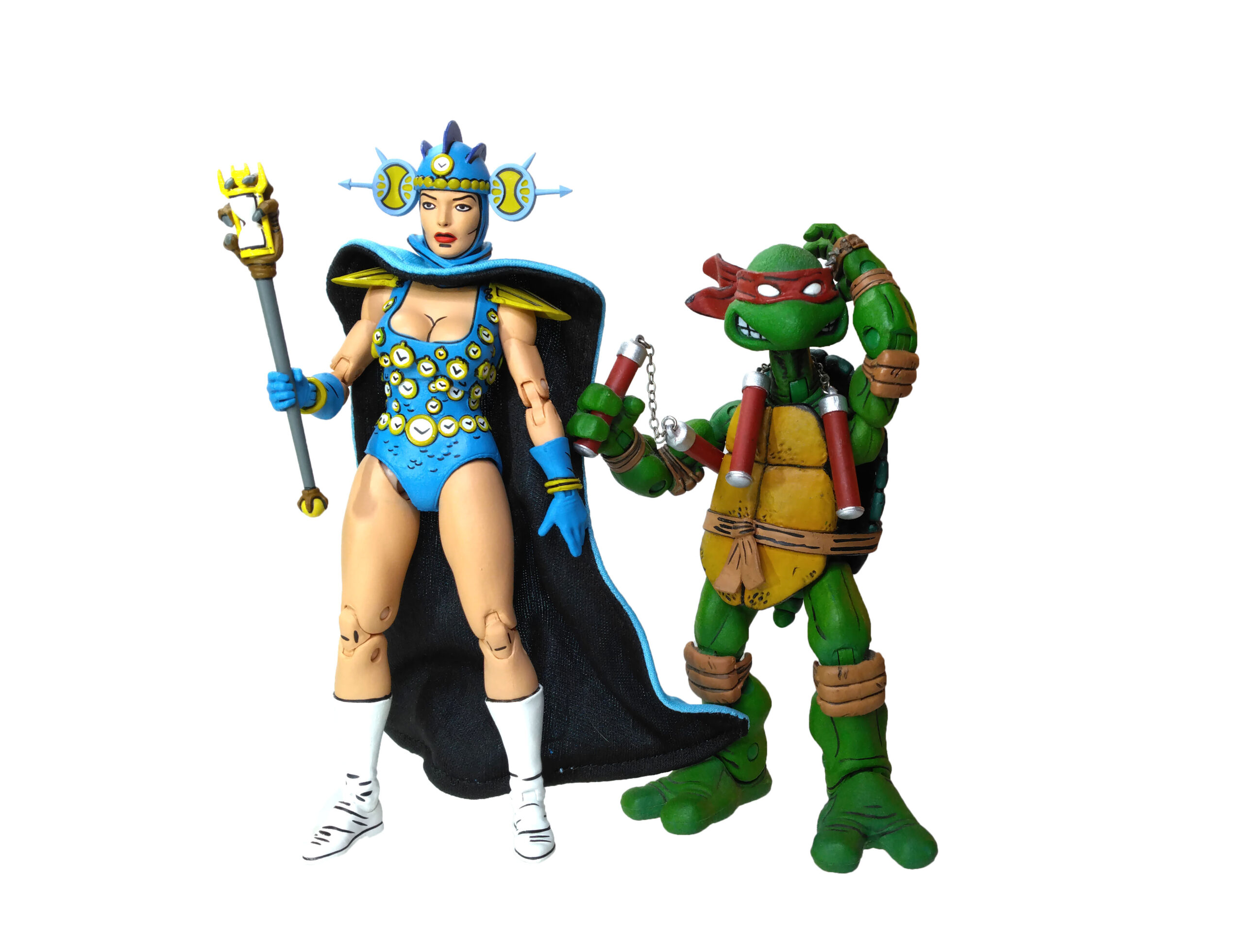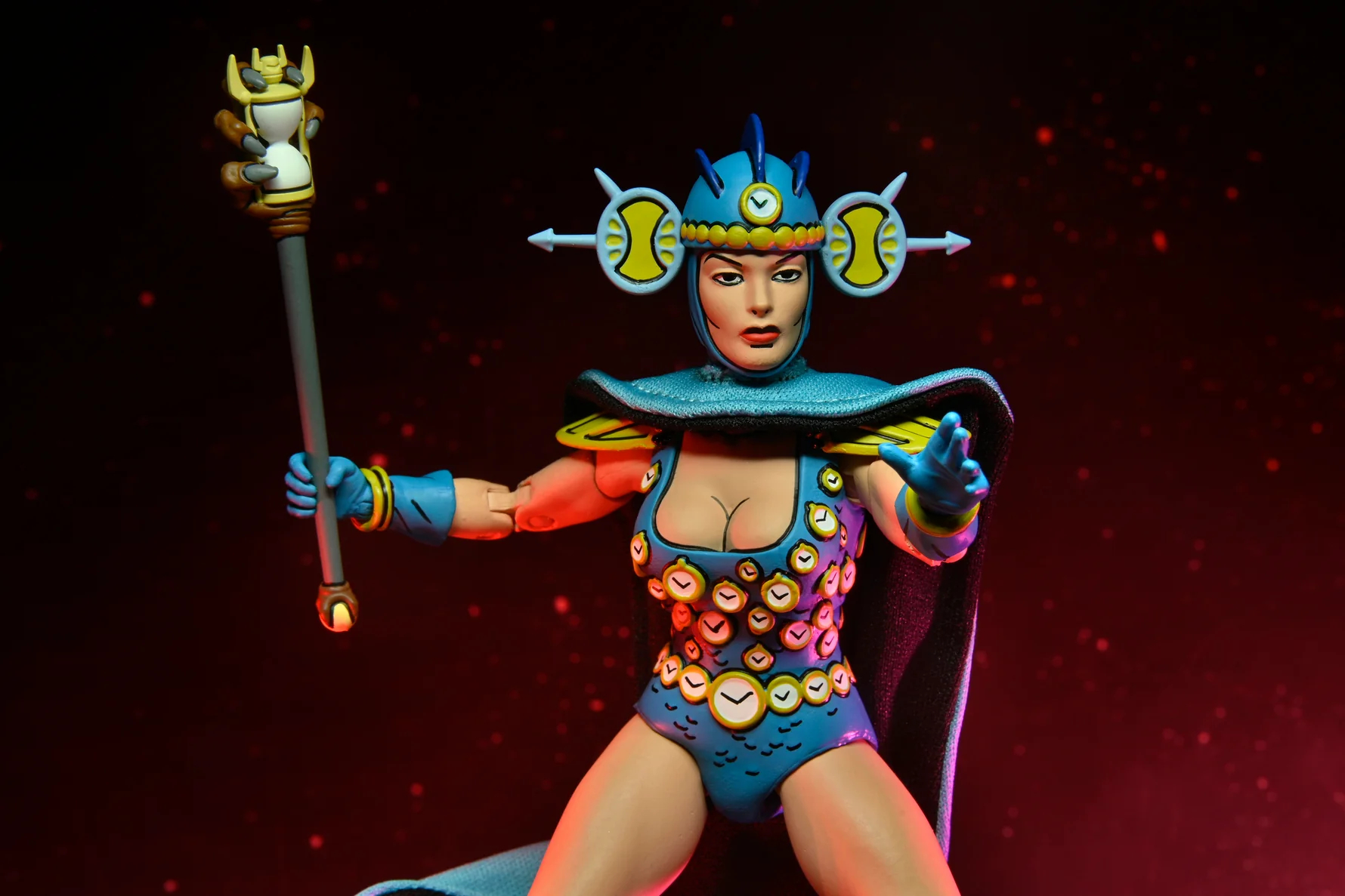 Outre les accessoires classiques, Renet possède un nombre intéressant d’objets de petite taille. À commencer par le sceptre du temps. Cet artefact est très finement sculpté et de toute beauté, avec cette main griffue qui s’empare du sablier en son centre. Il va parfaitement entre les mains de Renet. L’année suivante, NECA a réalisé Savanti Romero. Le personnage, très grand, était également accompagné d’un sceptre issu du même numéro. Mais dont les dimensions ont largement été revues à la hausse pour correspondre à son échelle (peut-être disproportionnée ?). Les finitions sont également bien moins bonnes que pour le sceptre de Renet, sans oublier les peintures.