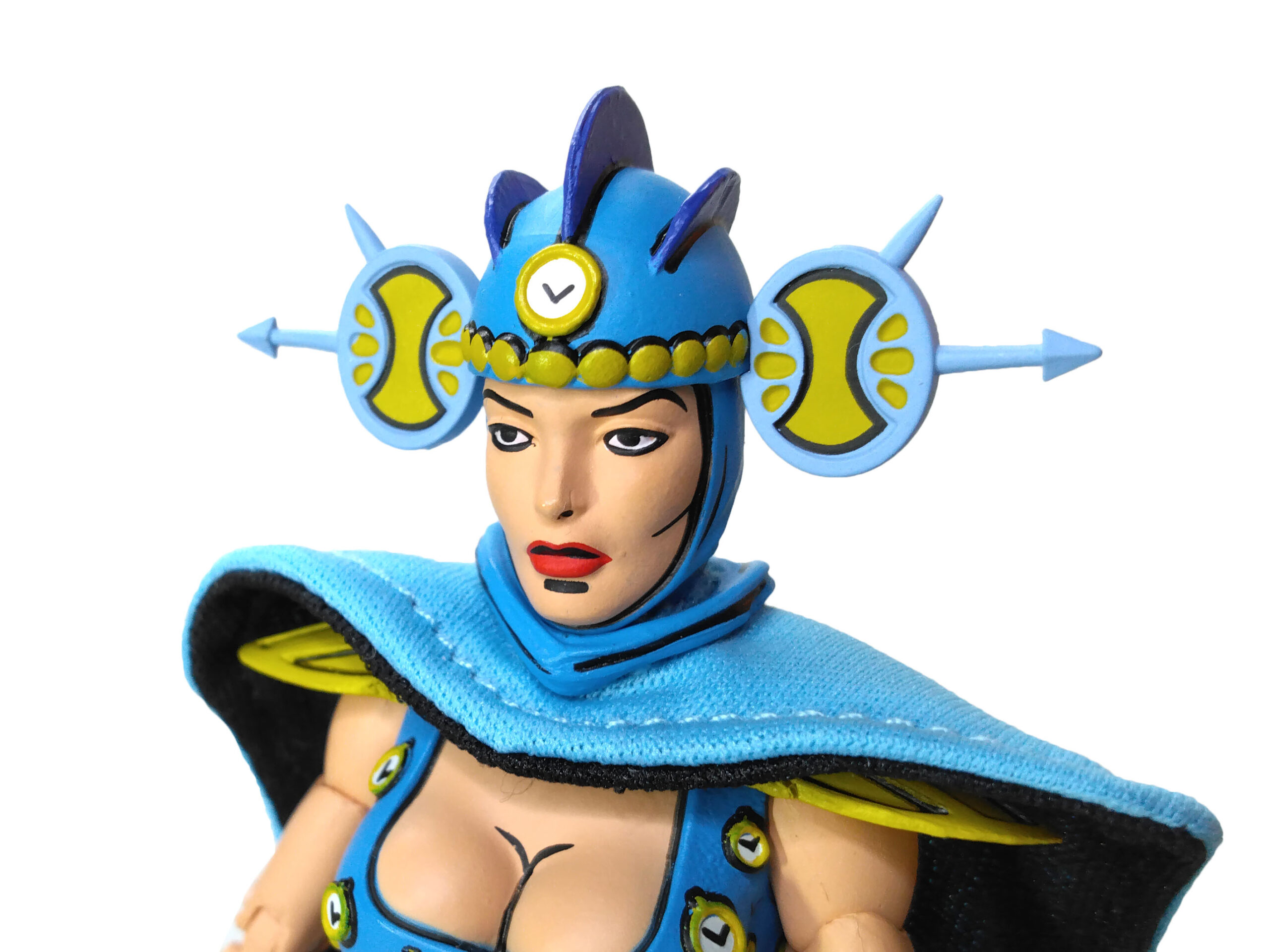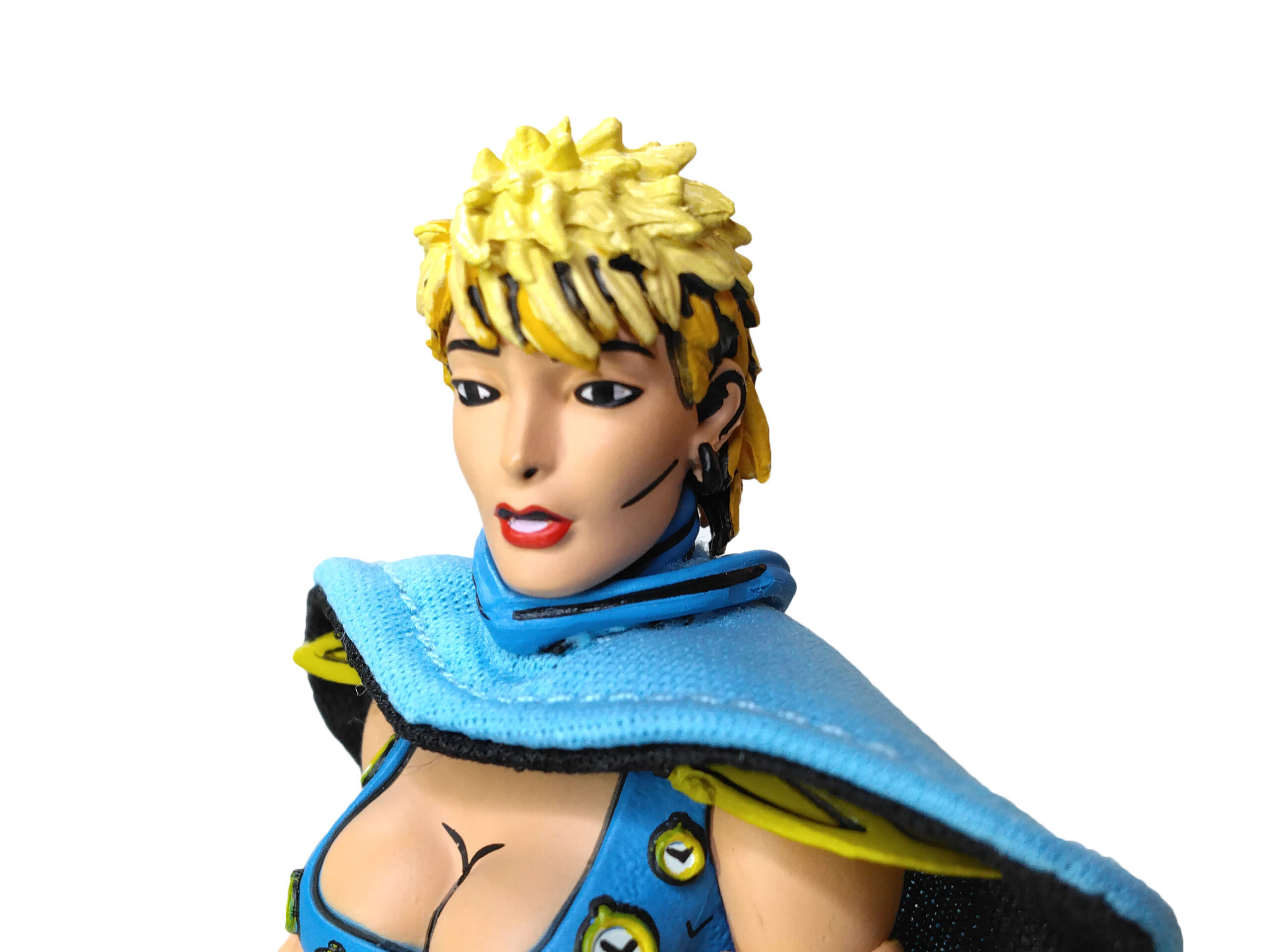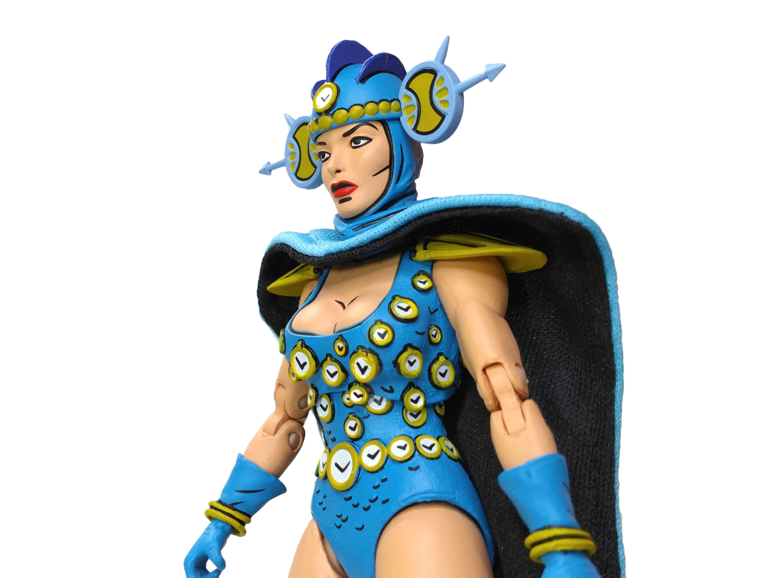 Le reste de sa tenue garde ces mêmes teintes, bleues et dorées, au niveau des épaulettes, du casque ou encore de ses bracelets. Le tout est relevé par des traits noirs pour accentuer le côté comic book, comme on peut le retrouver sur les figurines de cette gamme.