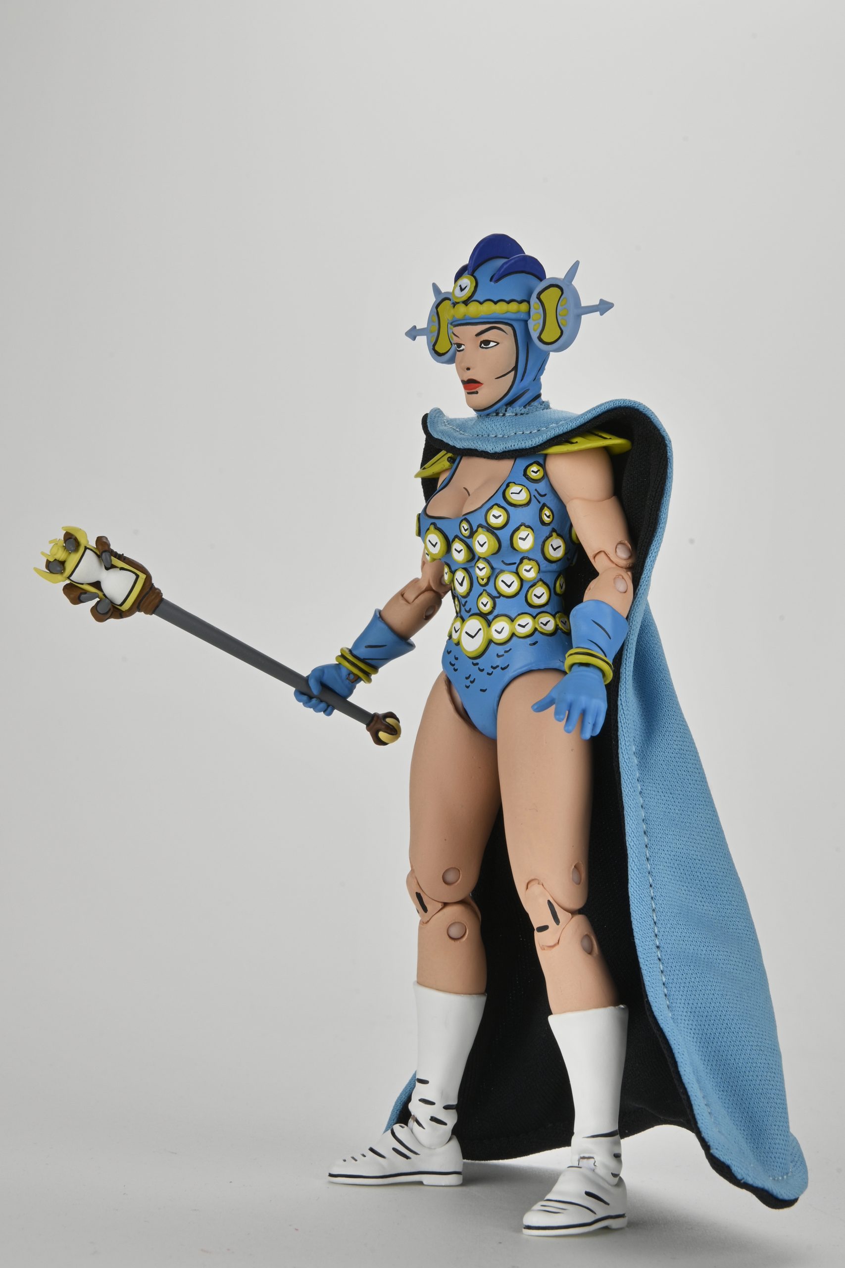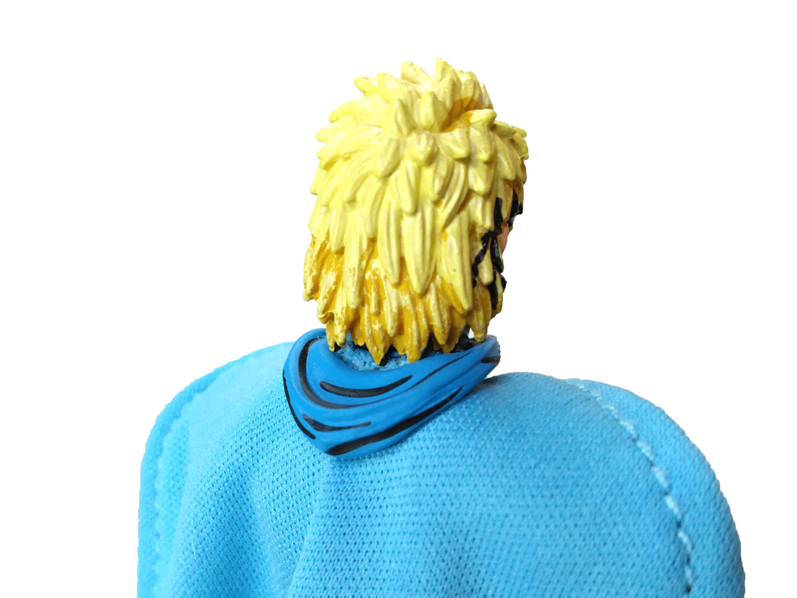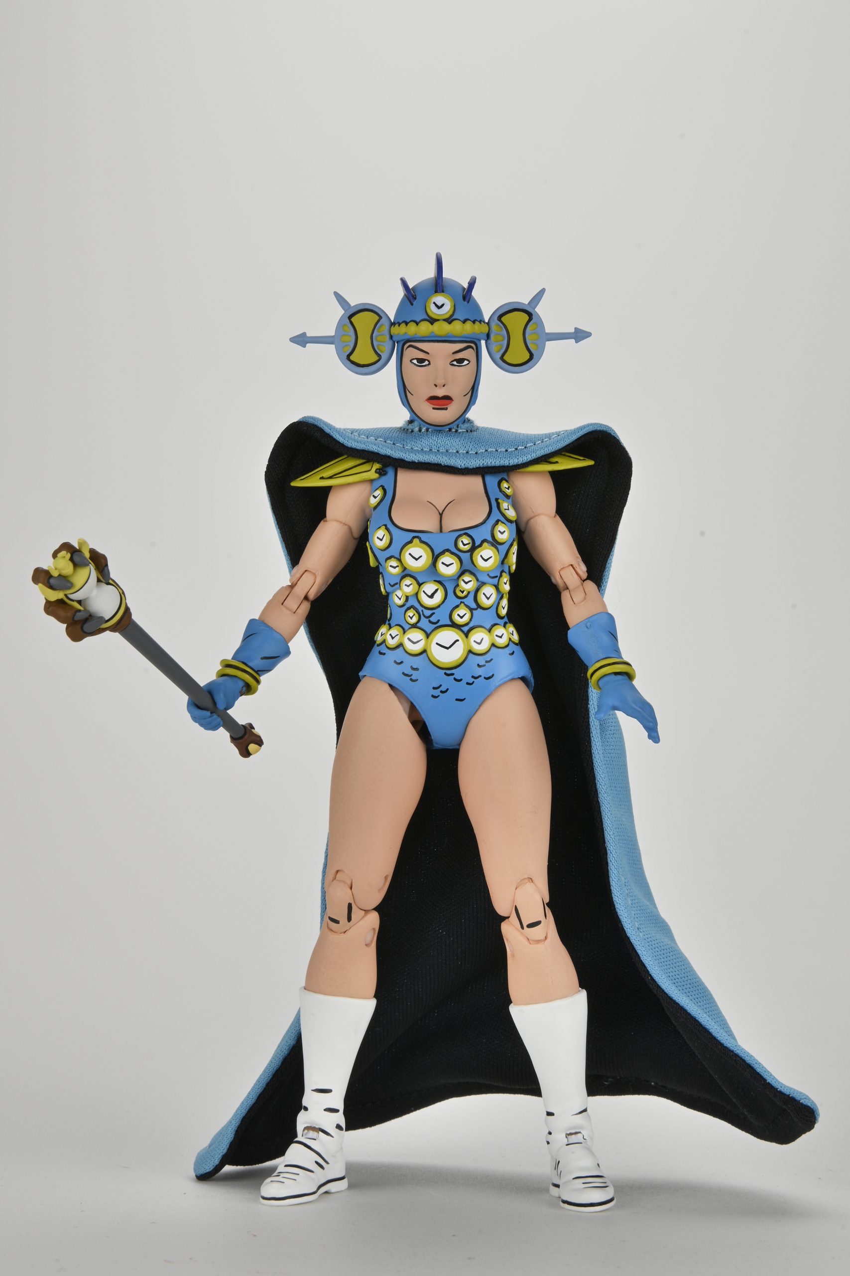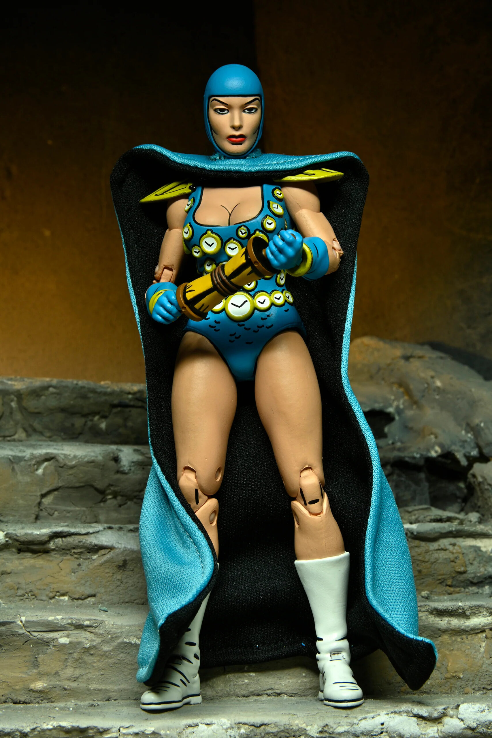 Le reste de sa tenue garde ces mêmes teintes, bleues et dorées, au niveau des épaulettes, du casque ou encore de ses bracelets. Le tout est relevé par des traits noirs pour accentuer le côté comic book, comme on peut le retrouver sur les figurines de cette gamme.