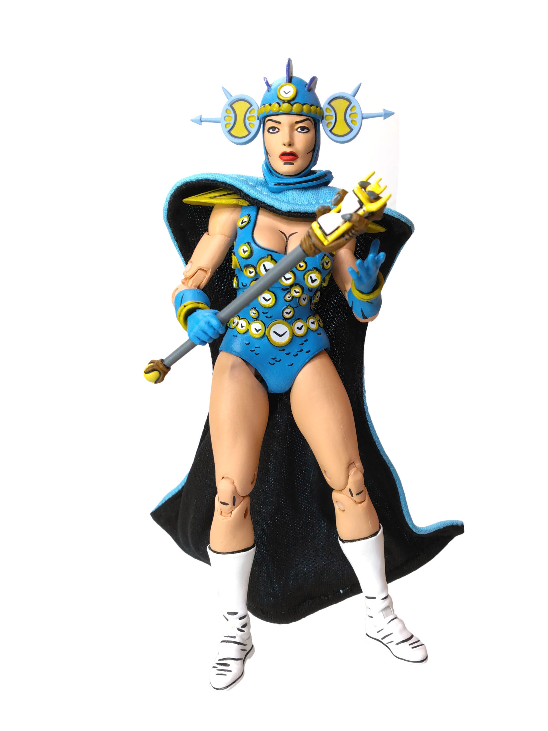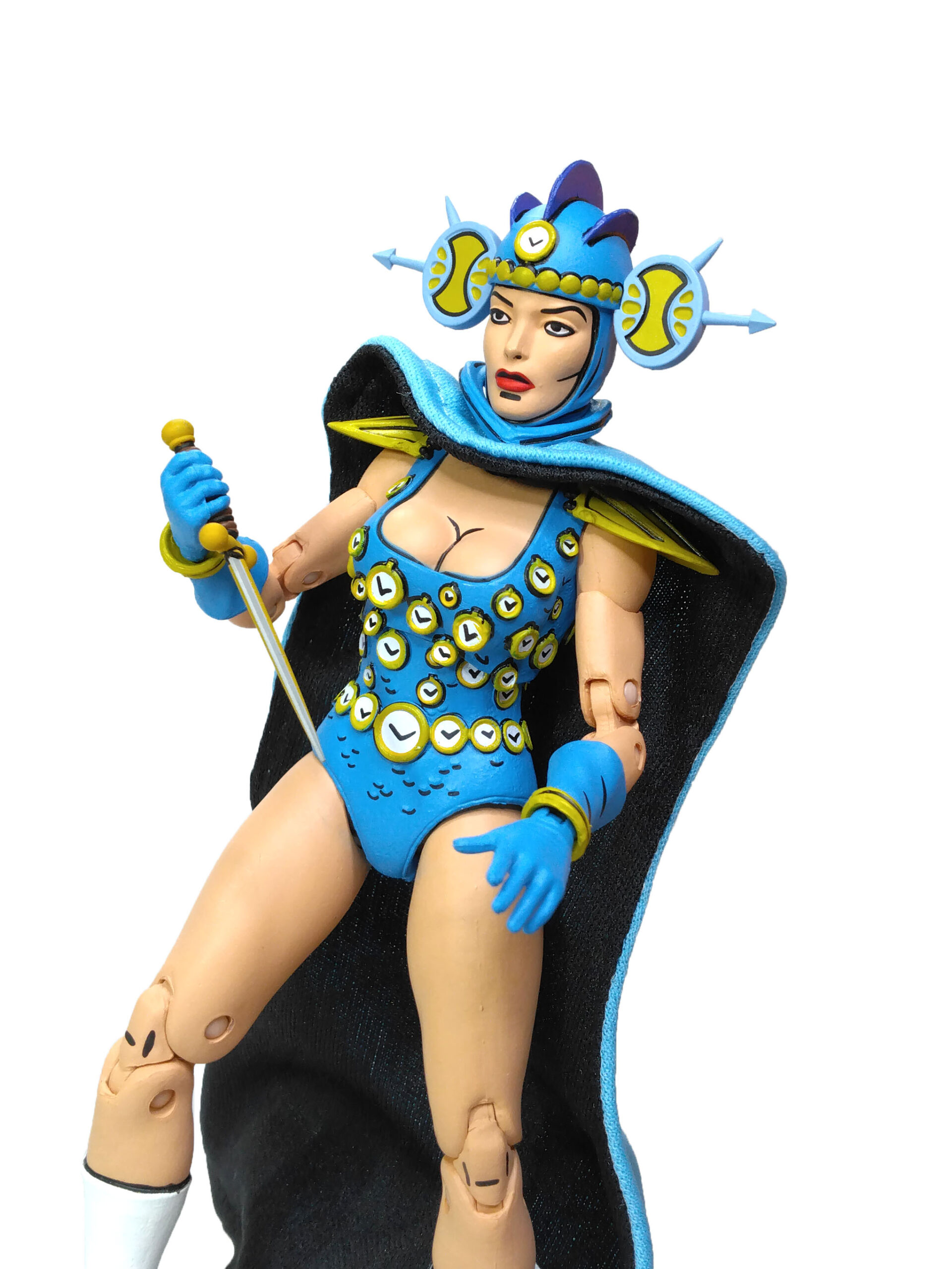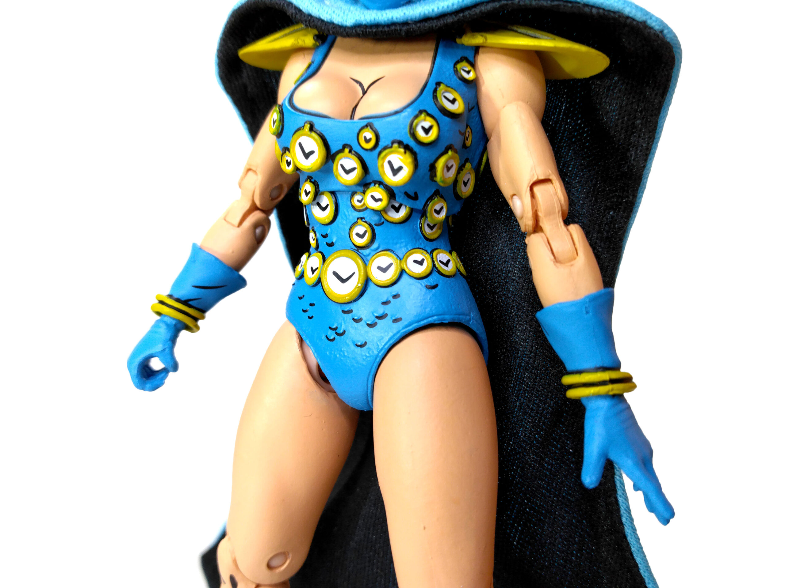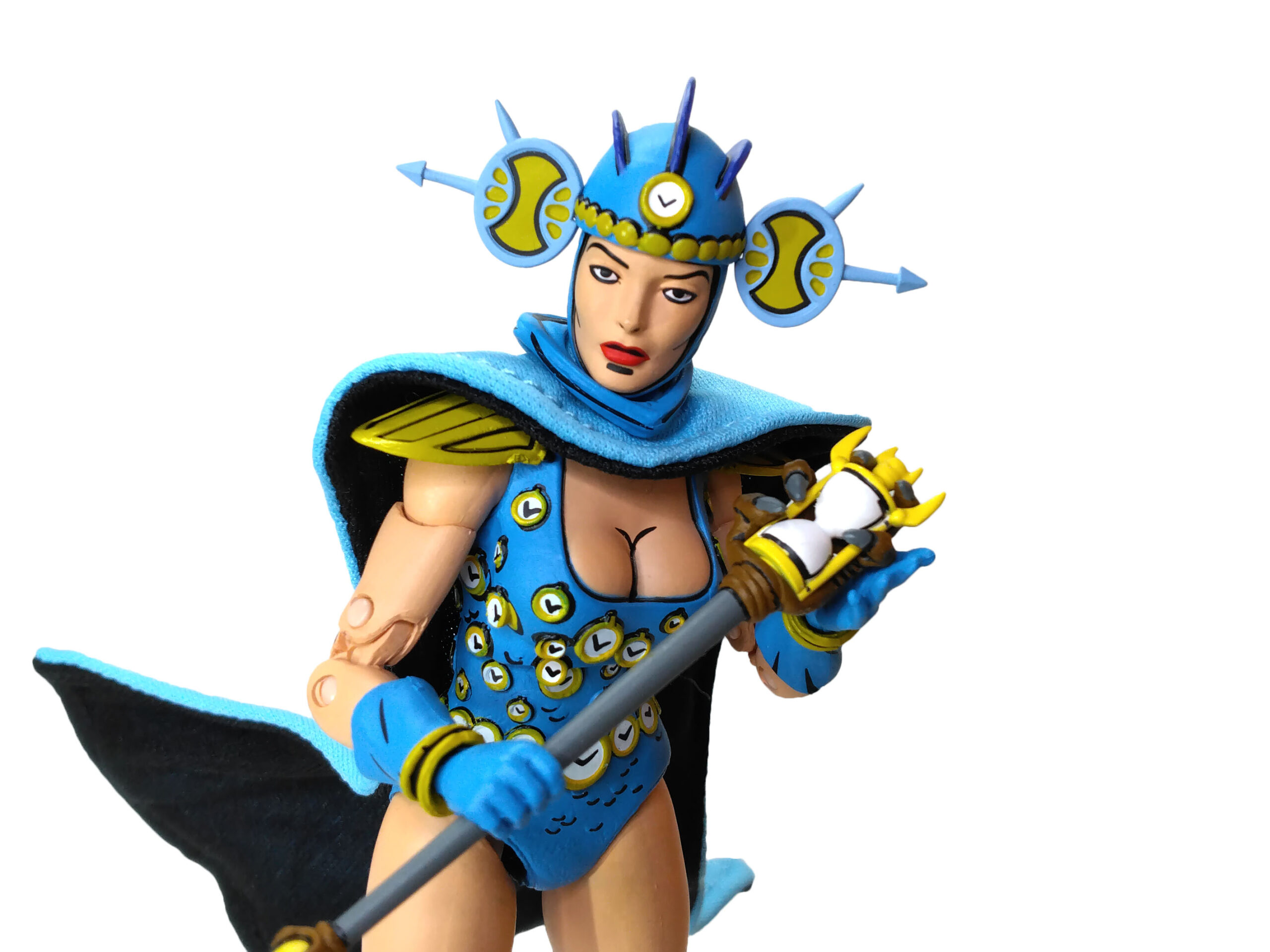 Nous retrouvons ainsi notre apprentie maîtresse du temps dans sa tenue bleutée. Un bleu plutôt très clair qui fonctionne très bien avec les nombreux détails de sa sculpture. Dont notamment les innombrables petites horloges qui se trouvent sur sa combinaison. Celles-ci sont toutes peintes de blanc, avec un pourtour jaune/doré et des aiguilles. À cela rajoutons également des petites écailles peintes de noir.