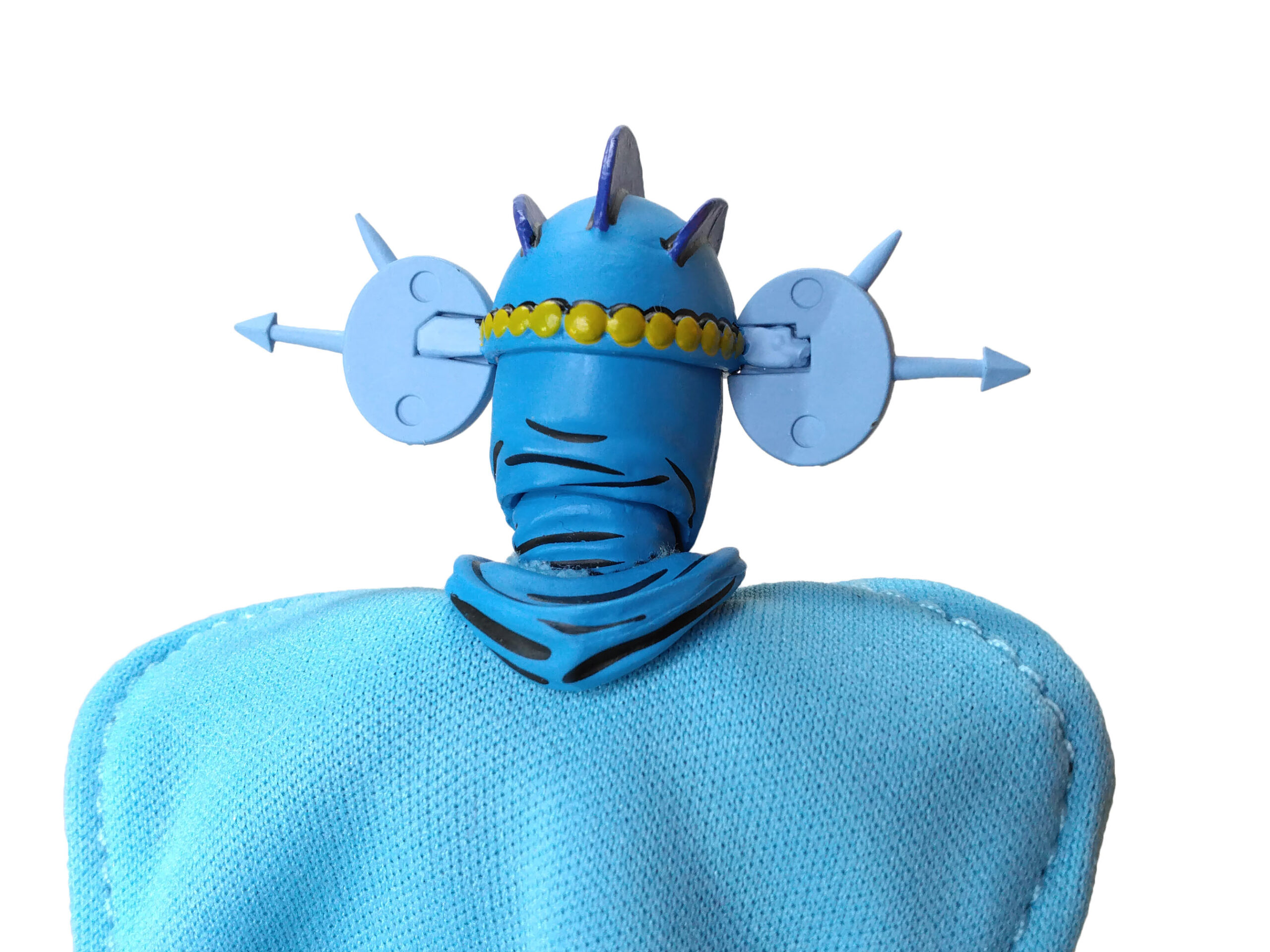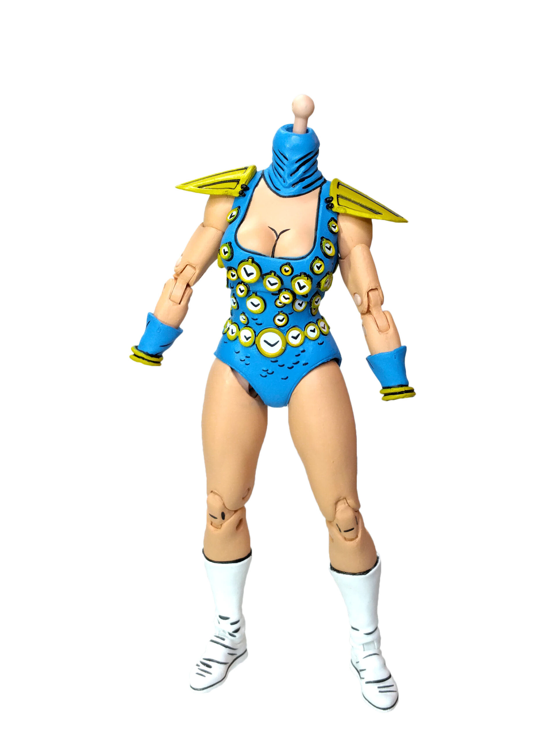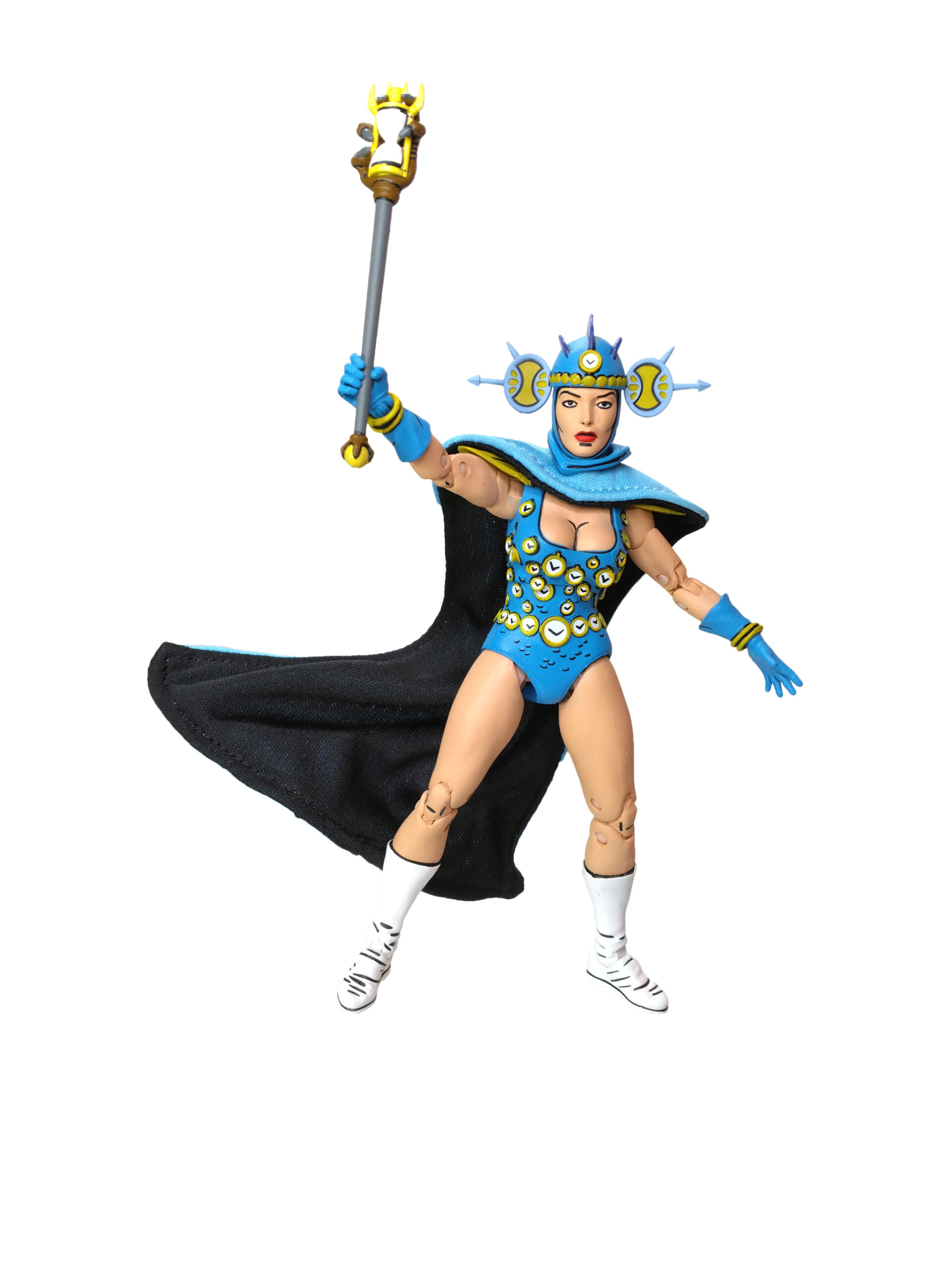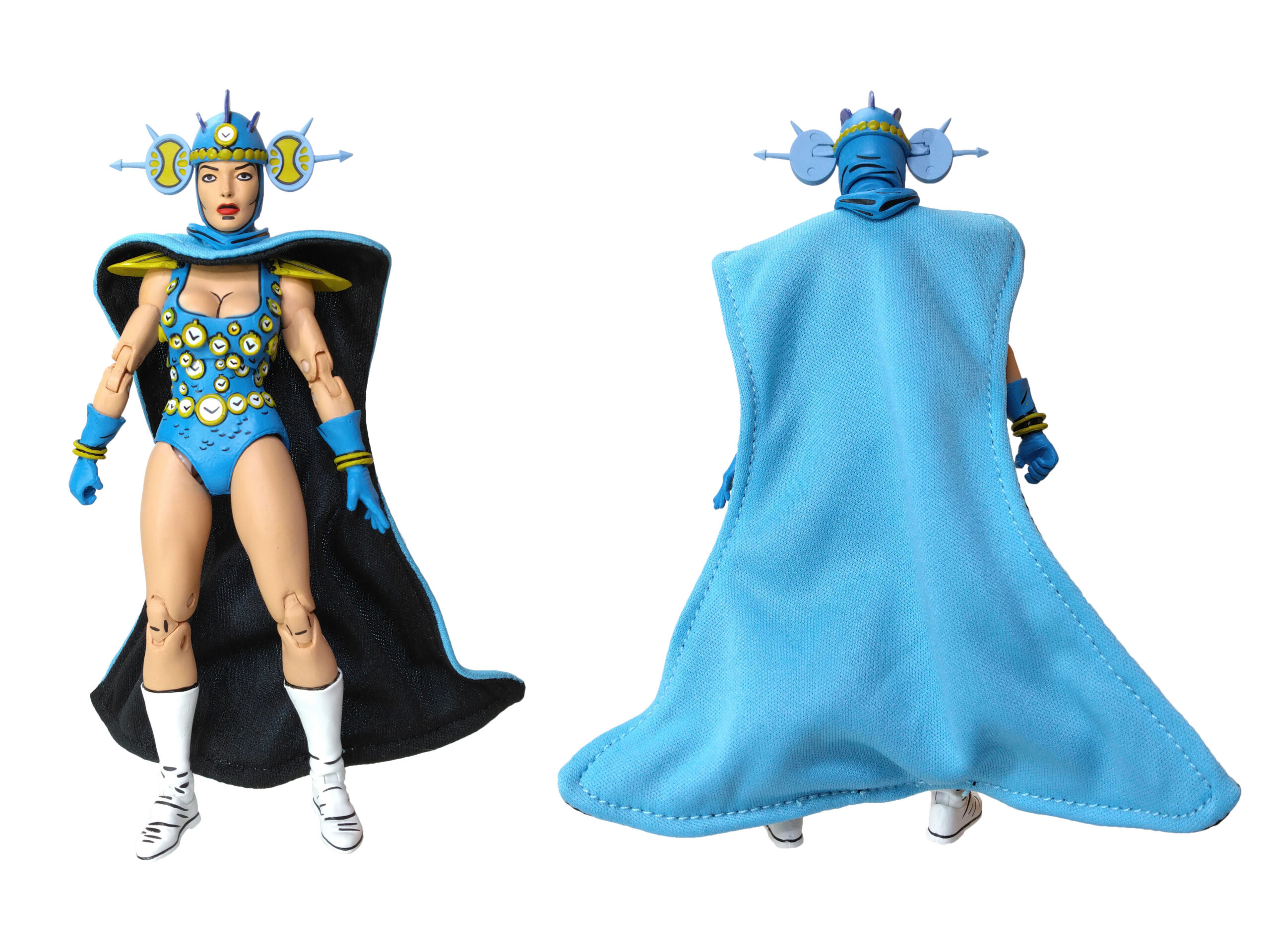 Nous retrouvons ainsi notre apprentie maîtresse du temps dans sa tenue bleutée. Un bleu plutôt très clair qui fonctionne très bien avec les nombreux détails de sa sculpture. Dont notamment les innombrables petites horloges qui se trouvent sur sa combinaison. Celles-ci sont toutes peintes de blanc, avec un pourtour jaune/doré et des aiguilles. À cela rajoutons également des petites écailles peintes de noir.