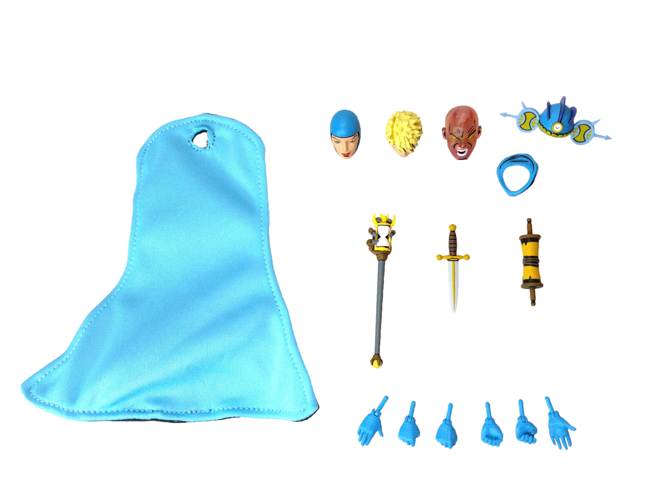 Cette version de Renet est accompagnée des mêmes accessoires que pour la figurine aux teintes rouges. Nous retrouvons au menu trois paires de mains, deux têtes interchangeables, la tête de Lord Simultaneous, un casque, un couteau, un parchemin, une cape et un col retroussé.