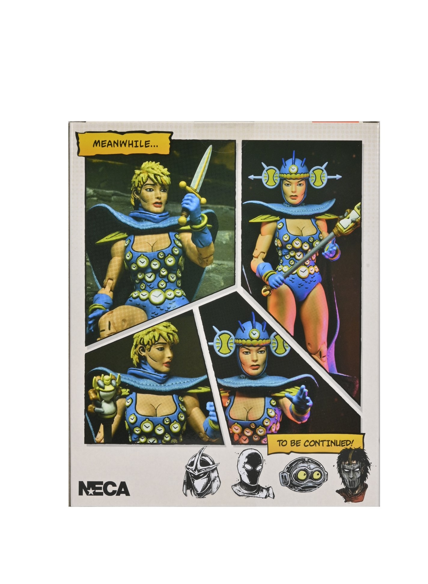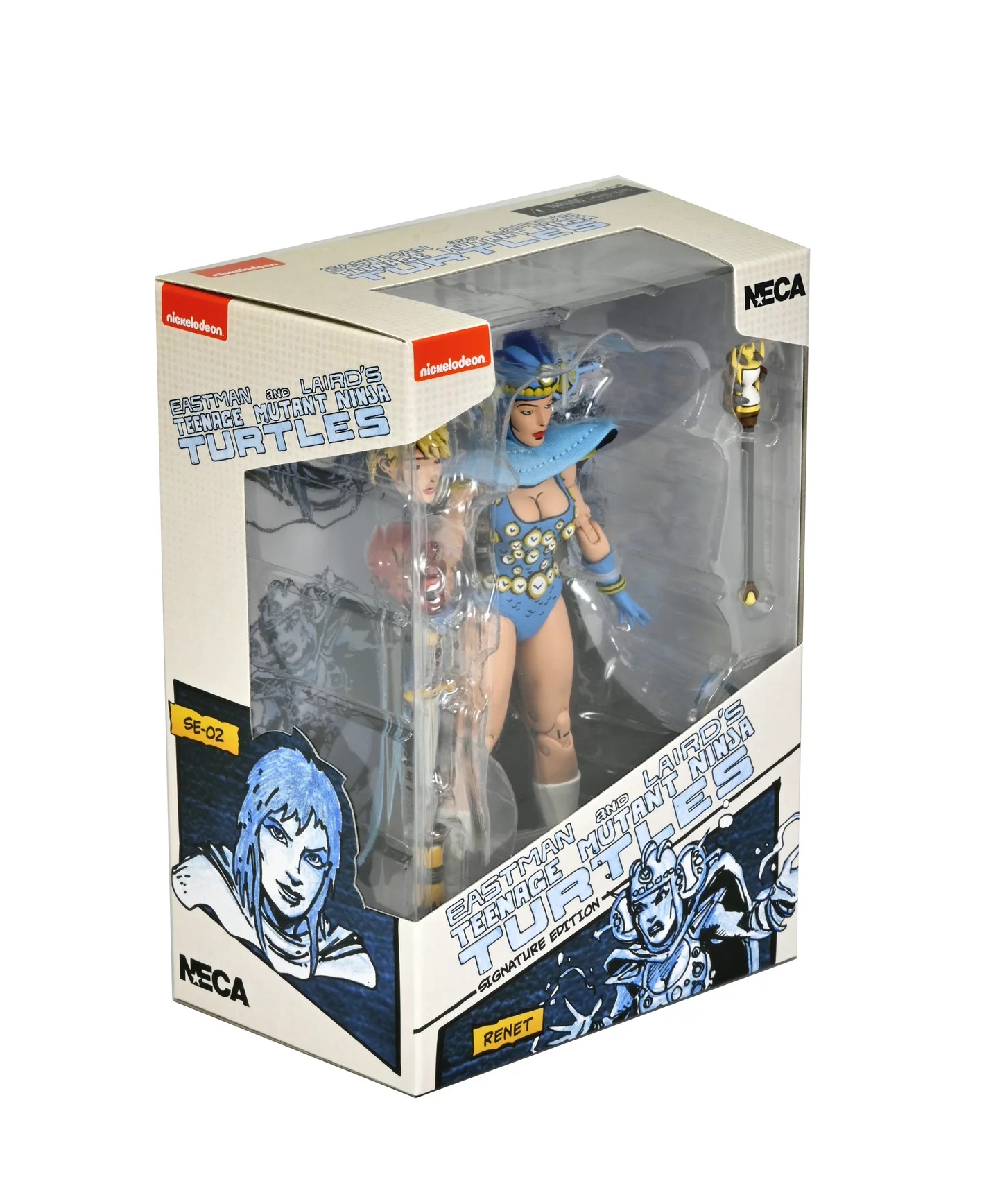 L’avant de la boîte présente la figurine dans une fenêtre plastique transparente, laissant apparaître l’apprentie maîtresse du temps en son sein. Les côtés sont également illustrés par le cocréateur des Tortues Ninja. Nous observons un petit encart où il est inscrit « SE-02 », rappelant qu’il s’agit de la deuxième figurine de cette gamme pour les Signature edition.
