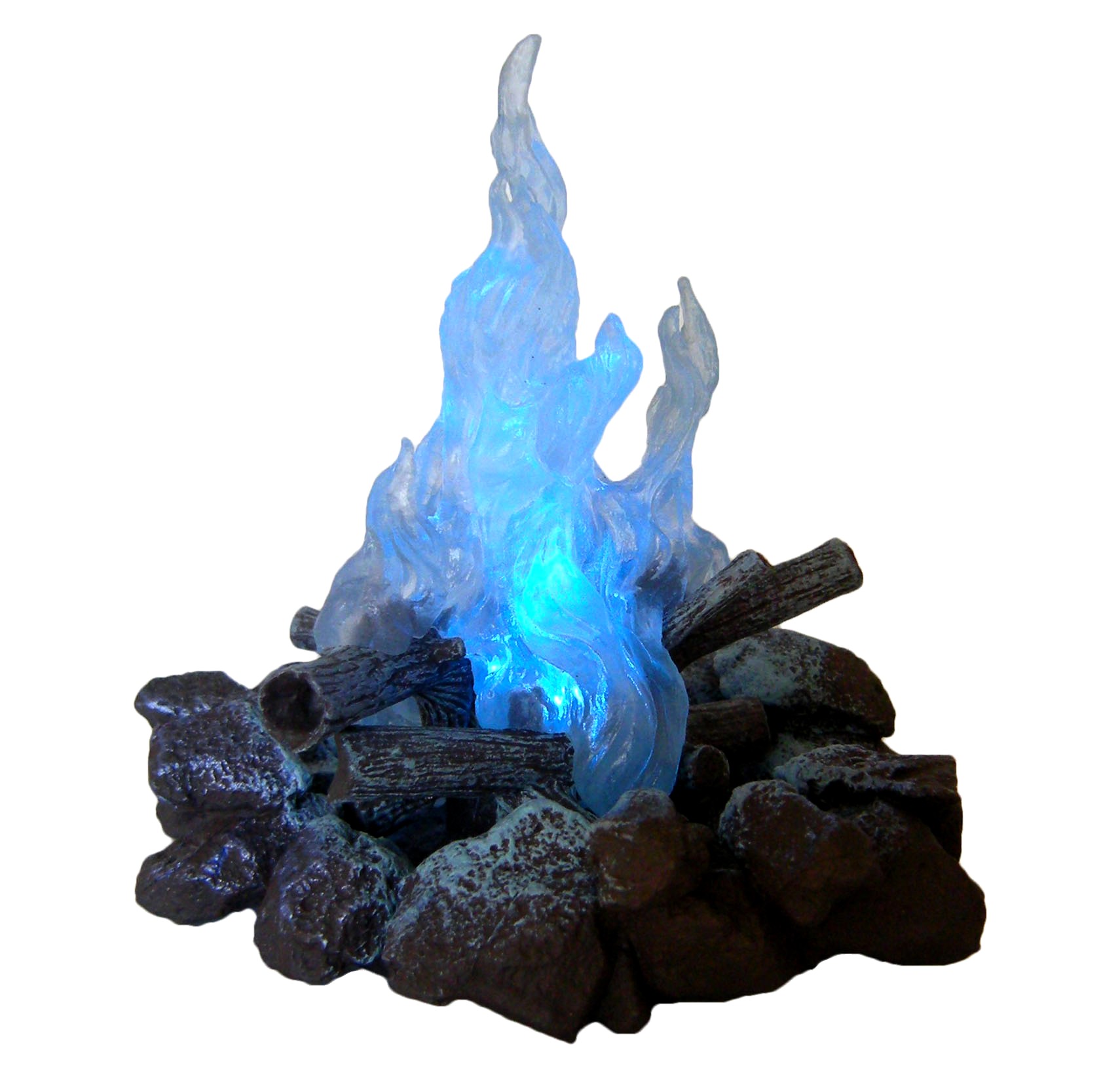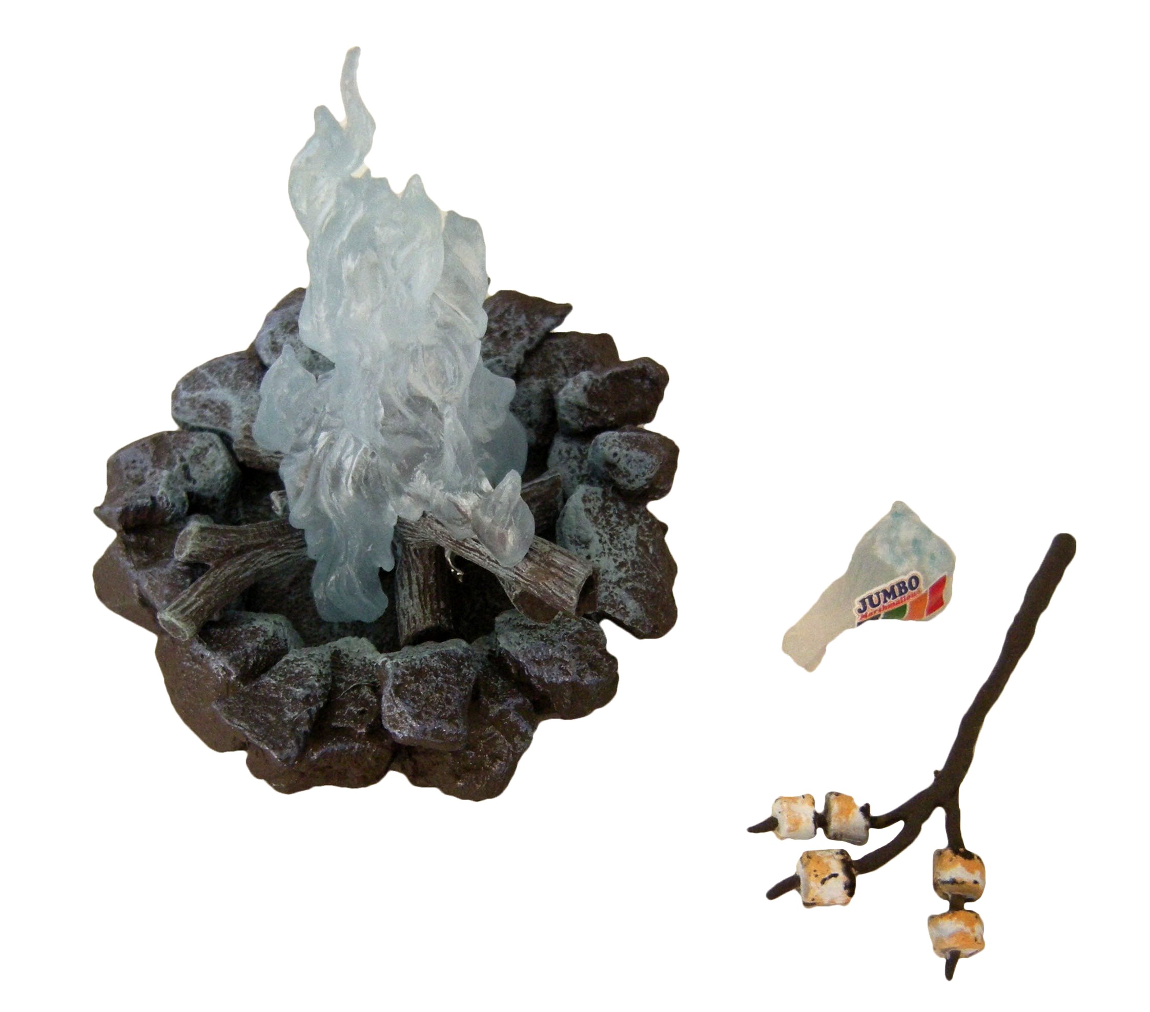 Les pierres qui composent le feu de camp sont moulées dans un plastique brun grisâtre foncé, tout comme les branches de bois. Cette monochromie est brisée par un effet inattendu : la partie supérieure des pierres et des branches est légèrement bleutée pour simuler la douce lueur du feu.