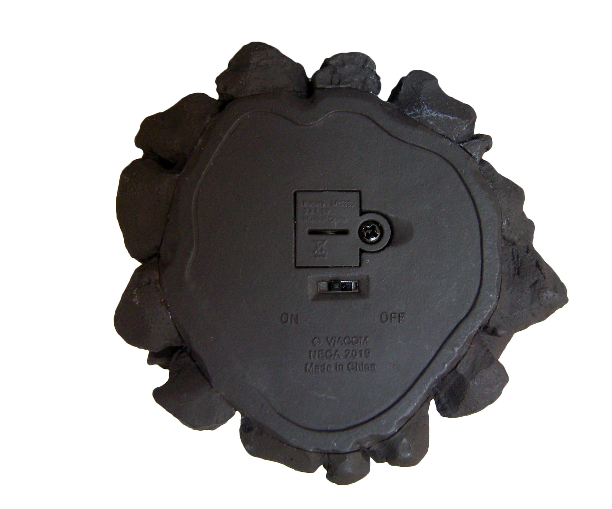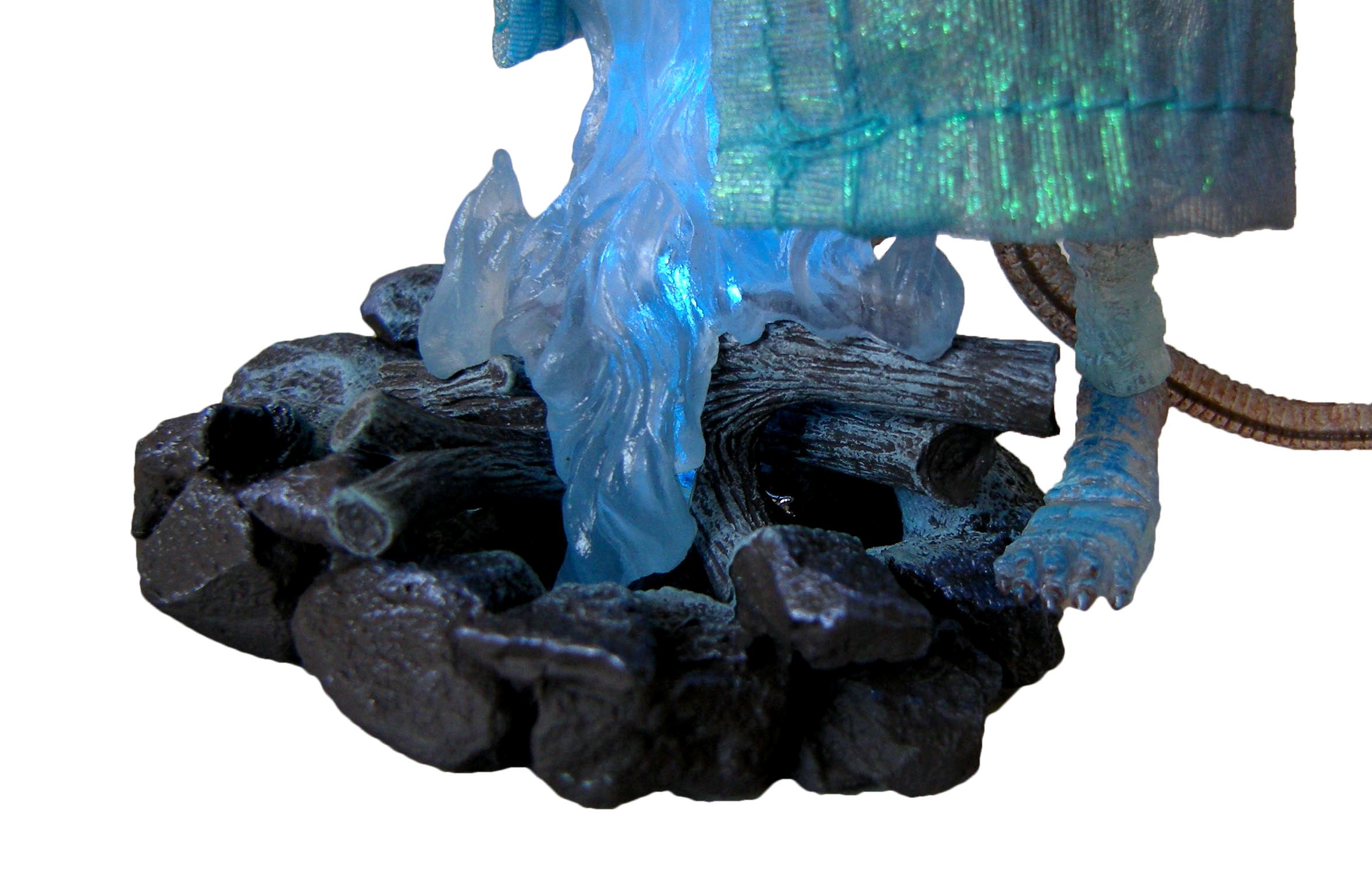 Outre sa robe, Splinter est accompagné de trois accessoires. Le principal est naturellement le feu de camp. Celui-ci est composé de rochers formant un cercle de presque 10 cm de diamètre. C’est dans cette base que se situe le système électronique permettant d’allumer la LED bleutée. Pour changer les piles, un petit clapet refermé par une vis se trouve sous la base, tout comme son interrupteur.