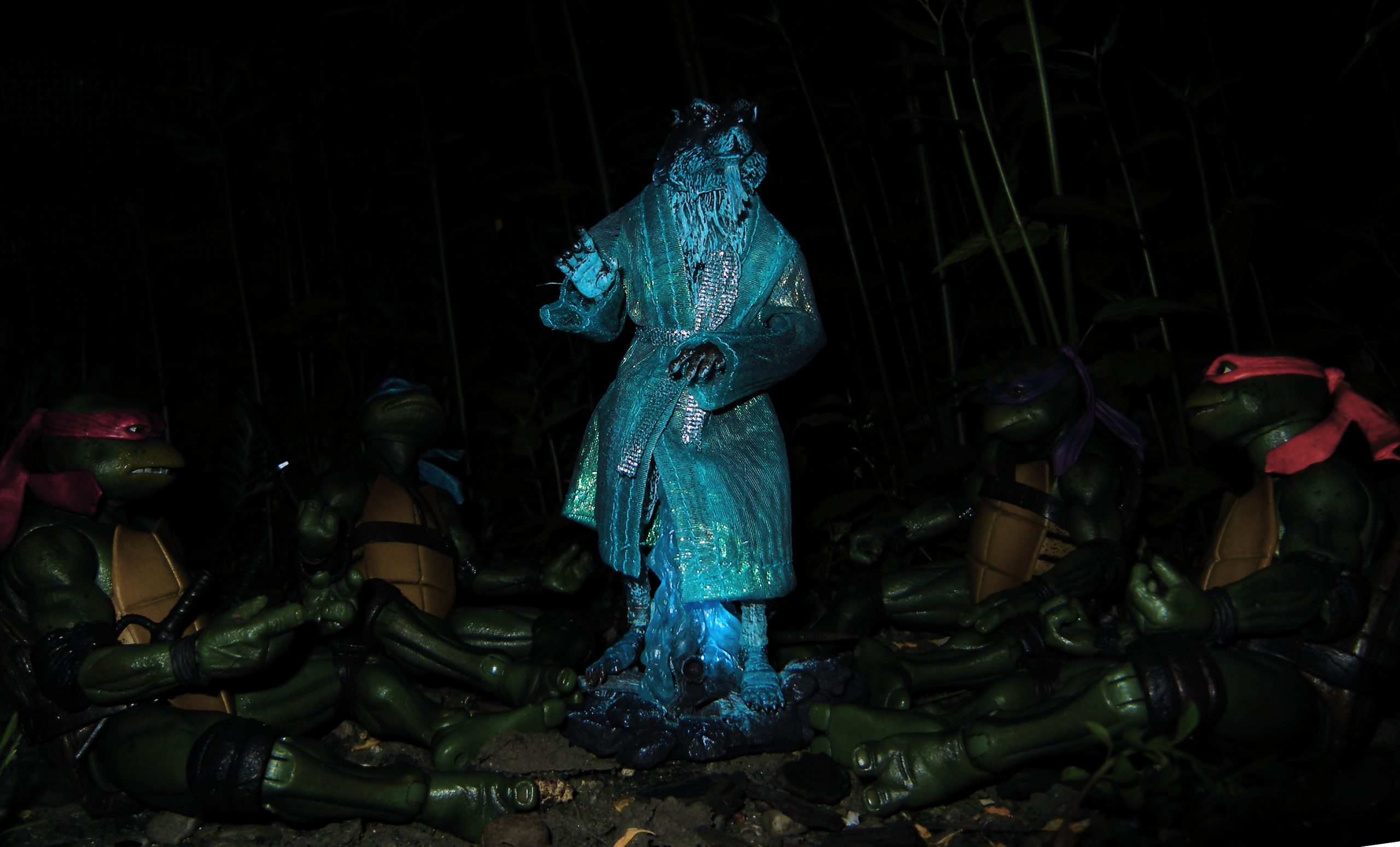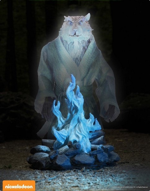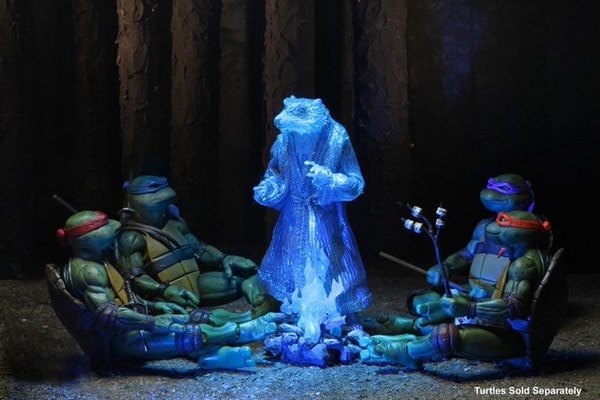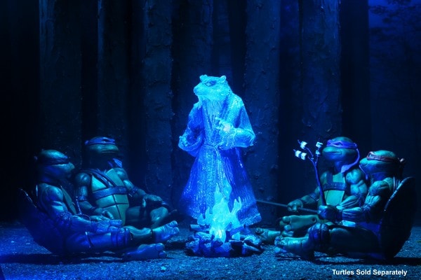 À l’automne 2019, NECA annonça un partenariat avec Lootcrate, connu pour la vente de packs mystères autour de licences et thèmes précis. Le 4 octobre, le distributeur lança une campagne de crowdfunding dans le cadre des célébrations du 30ème anniversaire du film des Tortues Ninja, en 2020. Cette figurine du Spirit of Splinter rend hommage à la scène où l’esprit du rat apparaît à ses fils au coin d’un feu dans la forêt de Northampton. Elle est quasiment identique à celle sortie pour la deuxième wave. Elle différait principalement au niveau de la couleur, ainsi que d’autres détails qui seront abordés au cours de cette review.