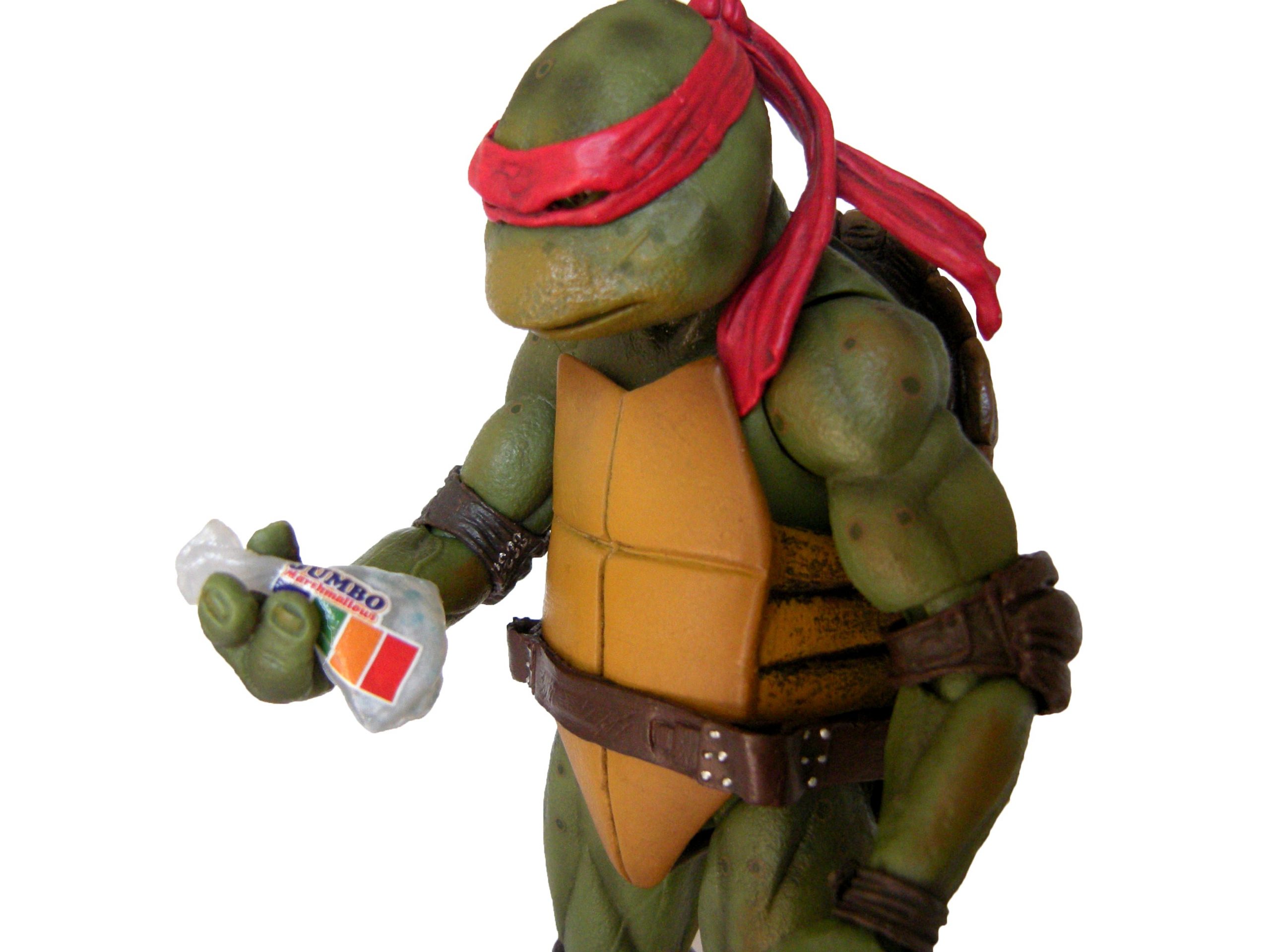 Le sac de marshmallows est plutôt petit pour les mains des tortues. Resserré au niveau de son col, il est toutefois assez difficile de le faire tenir entre les mains des mutants, dont les doigts sont si difficiles à écarter. Réalisé dans un plastique transparent, sa partie basse est renforcée par un jeu de tons plus foncés imitant la présence de bonbons dans le sac. Tout comme la pizza de Domino’s Pizza dans le pack Baby turtle de 2018,