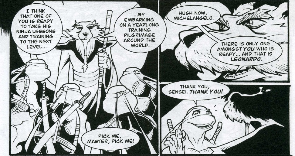 De retour avec ses frères, il essuie un blâme de Leonardo, pour les avoir abandonné, et rentrent tous les quatre dans les égouts. Sur le chemin, Donatello et Michelangelo parlent d’un projet de costume pour la tortue au bandeau orange, que son frère se propose de lui confectionner pour le superviser à distance. Dans le repaire, Splinter réunit ses fils pour leur annoncer qu’il est temps pour l’une des tortues de partir faire une sorte de pèlerinage en ermite. Michelangelo se propose de suite, mais en réalité, le rat avait déjà une idée de qui devrait le réaliser : la tortue la plus mature du groupe, et la plus épanouie dans les arts martiaux : Leonardo. Raphael est excédé de voir toute l’attention portée sur son frère, et préfère s’en aller. Leonardo essaie de le retenir, mais rien y fait, et les deux tortues se disputent encore.