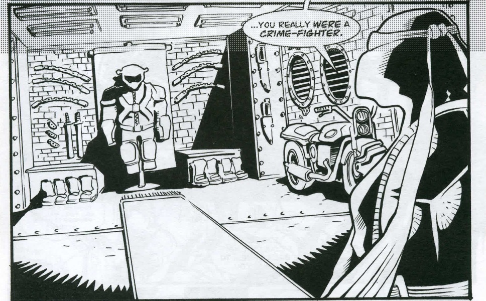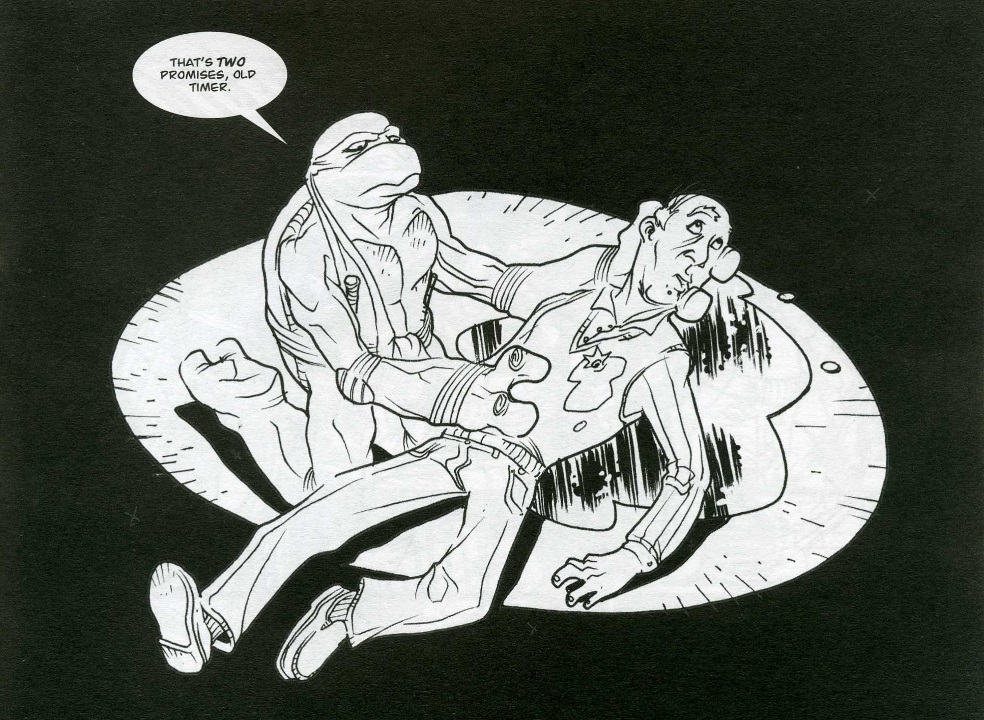 Dans la rue, Raphael sauve une jeune prostituée qui se faisait voler son sac, et dont les agresseurs voulaient encore profiter. Il n’a pas de pitié pour eux, et les laisse dans un très mauvais état. Mais soudain, il ne tarde pas à croiser de nouveau David Merryweather, qui lui propose de le suivre. Il l’emmène dans sa maison à Harlem et lui demande de lui en raconter plus à son sujet. Après que Raphael se soit présenté, le vieil homme lui révèle qu’il était lui aussi un justicier, quand il était encore en forme. Raphael voit bien que l’homme a quelque chose à lui proposer, mais au même moment, la tortue a son téléphone qui sonne : Splinter lui rappelle que Leonardo est sur le point de partir, et qu’il faut qu’il rejoigne sa famille au plus vite. Raphael s’en va, mais sur le chemin, entend un coup de feu retentir dans la rue, en direction de la maison de David. Il voit là trois hommes en sortir, et il se précipite dedans pour voir