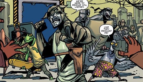 Dans les rues sombres de la ville, Pigeon Pete escortait Lindsey Baker jusqu’au repaire des Mutanimals. Discutant d’un sujet absurde, la jeune femme se rendait vite compte que le pigeon notait les réponses à ses questions. Old Hob avait demandé au pigeon de lui rapporter tout ce qu’elle disait. Pete ne voyait pas cela comme de l’espionnage, c’était juste son travail. La scientifique ne comprenait pas pourquoi le chat borgne ne lui faisait toujours pas confiance, depuis le temps qu’ils travaillaient ensemble (TMNT #34). Soudain, une main saisit Pete, qui fut immédiatement jeté au sol. Lindsey essaya de lui venir en aide mais fut retenue. Un homme pointait une arme à feu sur la tête du pigeon. L’un des hommes le défendait, rappelant à ses larbins qu’ils voulaient certes la femme, mais le mutant pouvait être un excellent bonus dans leur mission. Certainement Pigeon Pete subirait-il une dissection. Tous deux furent jetés à l’arrière d’une camionnette.